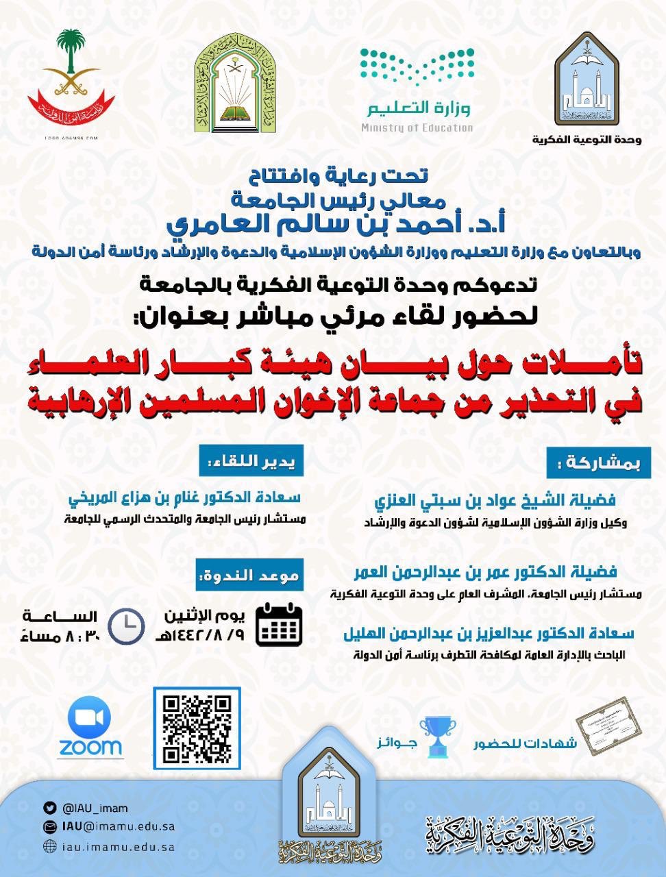 تحت رعاية معالي رئيس الجامعة أ.د. أحمد بن سالم العامري وبالتعاون مع وزارة التعليم ووزارة الشؤون الإسلامية والدعوة والإرشاد ورئاسة أمن الدولة ، تقيم وحدة التوعية الفكرية بالجامعة لقاء مرئي مباشر عبر برنامج زوم بعنوان تأملات حول بيان هيئة كبار العلماء في التحذير من جماعة الإخوان المسلمين الإرهابية وذلك يوم الأثنين 9/8/1442هـ الساعة 8.30 مساء وسيتم توزيع شهادات للحضور وجوائز