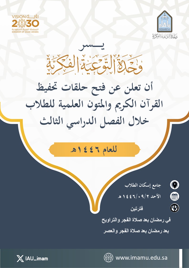 يَسر وحدة التوعية الفكرية أن تعلن عن فتح حلقات تحفيظ القرآن الكريم والمتون العلمية للطلاب خلال الفصل الدراسي الثالث للعام 1446هـ