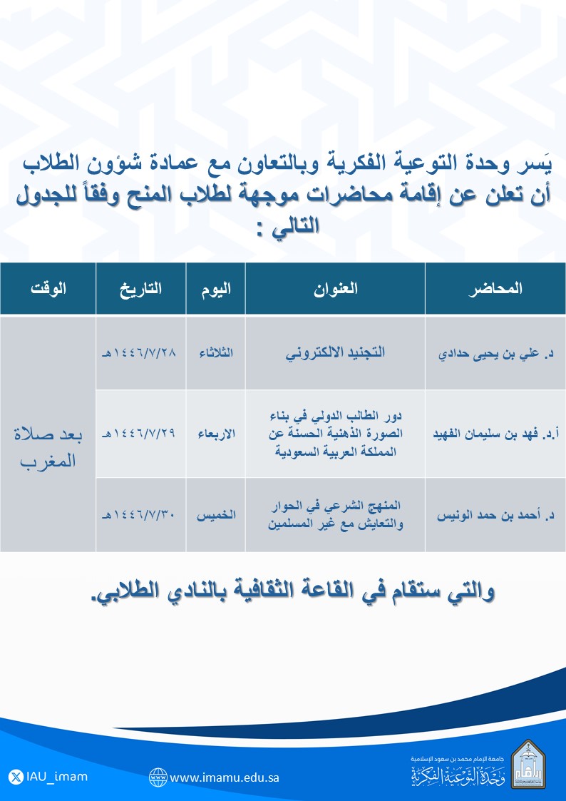 سر وحدة التوعية الفكرية وبالتعاون مع عمادة شؤون الطلاب أن تعلن عن إقامة محاضرات موجهة لطلاب المنح والتي ستقام في القاعة الثقافية بالنادي الطلابي وفقاً للجدول التالي :
