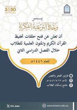 يَسر وحدة التوعية الفكرية أن تعلن عن فتح حلقات تحفيظ القرآن الكريم والمتون العلمية للطلاب خلال الفصل الدراسي الثاني للعام ١٤٤٦هـ.