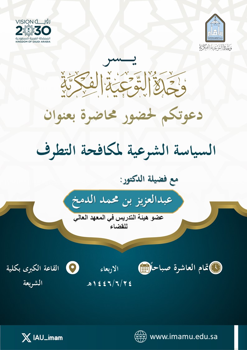 يَسر وحدة التوعية الفكرية دعوتكم لحضور محاضرة بعنوان : (السياسة الشرعية لمكافحة التطرف)، يلقيها فضيلة الدكتور : عبدالعزيز بن محمد الدمخ يوم الأربعاء 1446/6/24هـ الساعة العاشرة صباحاً في القاعة الكبرى بكلية الشريعة.