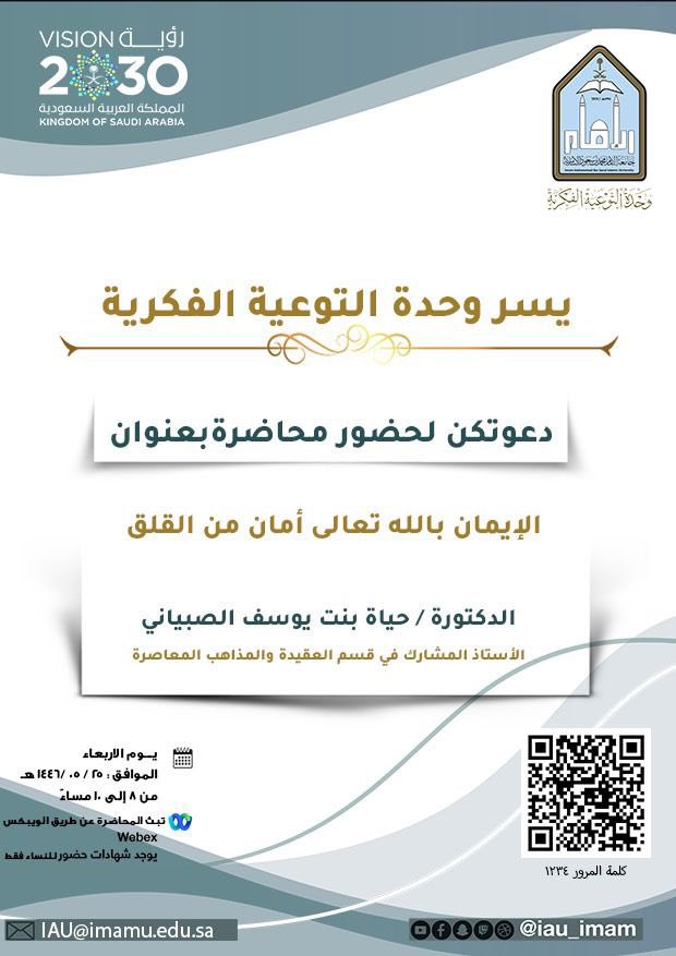 يَسر وحدة التوعية الفكرية دعوتكن لحضور محاضرة: (الإيمان بالله تعالى أمان من القلق) ضمن برنامج (حياة طيبة) مع الدكتورة: حياة بنت يوسف الصبياني يوم الاربعاء ١٤٤٦/٥/٢٥هـ الساعة ٨-١٠ مساءً. تبث المحاضرة عن طريق الويبكس ،يوجد شهادات حضور للنساء