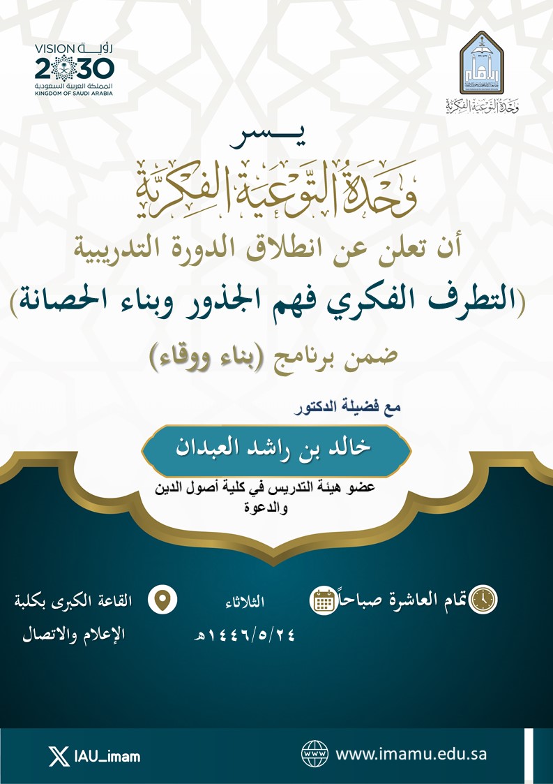 يَسر وحدة التوعية الفكرية أن تعلن عن انطلاق الدورة التدريبية (التطرف الفكري فهم الجذور وبناء الحصانة) ضمن برنامج "بناء ووقاء"، يوم الثلاثاء 24\5\1446هـ الساعة 10 صباحاً في القاعة الكبرى بكلية الإعلام والاتصال.