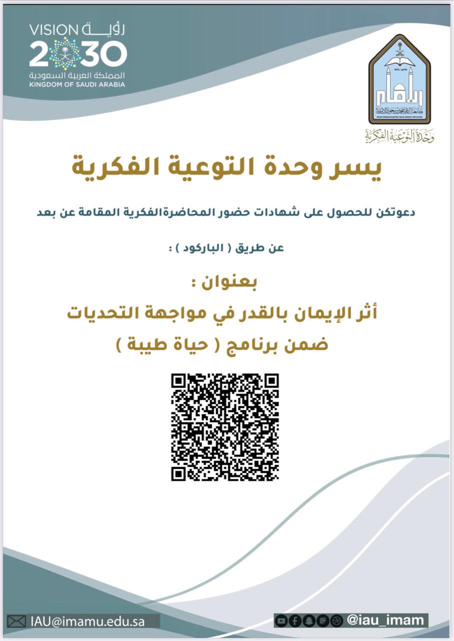 يَسر  وحدة التوعية الفكرية دعوتكن للحصول على شهادة الحضور لمحاضرة