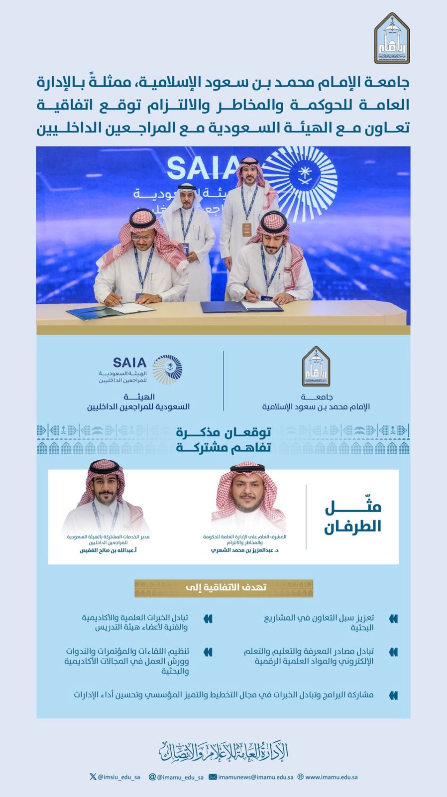 جامعة الإمام محمد بن سعود الإسلامية توقع مذكرة تعاون مع الهيئة السعودية للمراجعين الداخليين