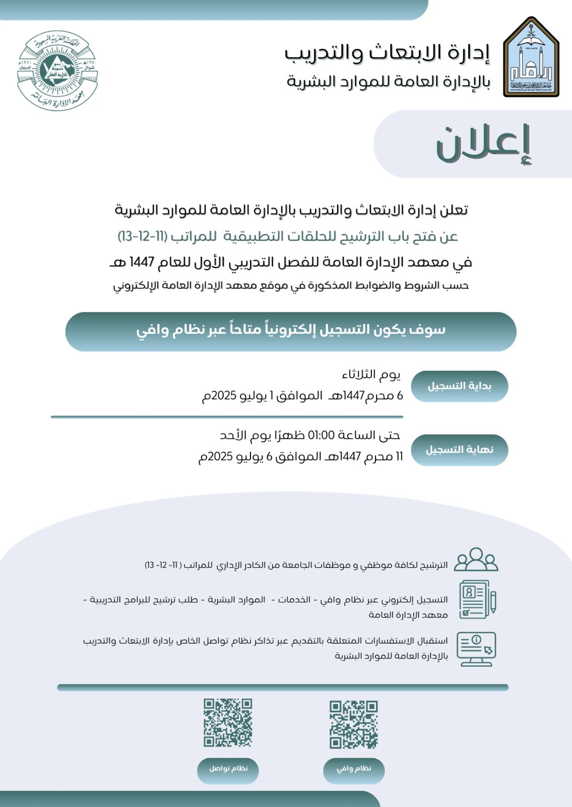 فتح باب الترشيح للحلقات التطبيقية للعام 1447 هـ للمراتب (11-12-13)