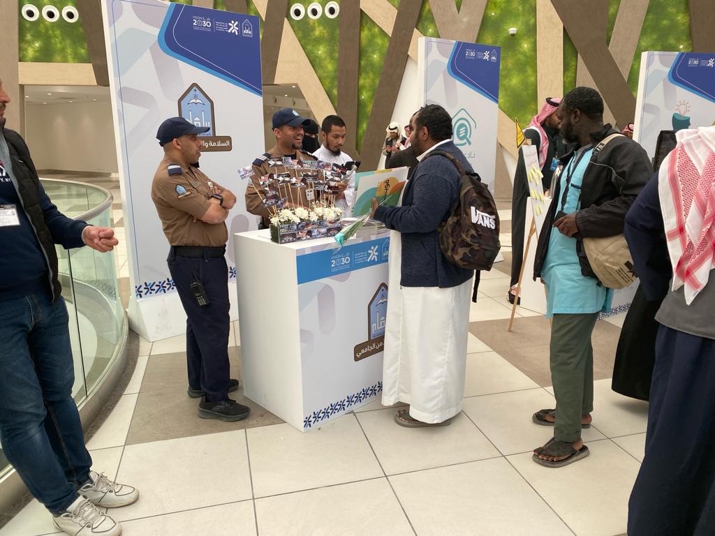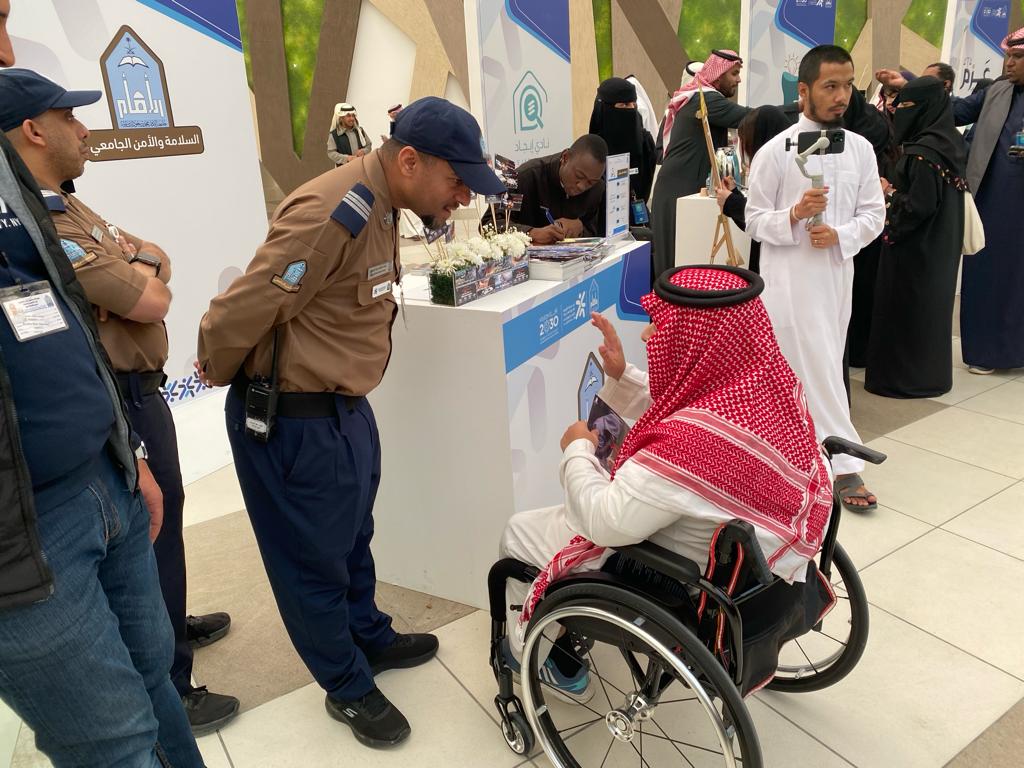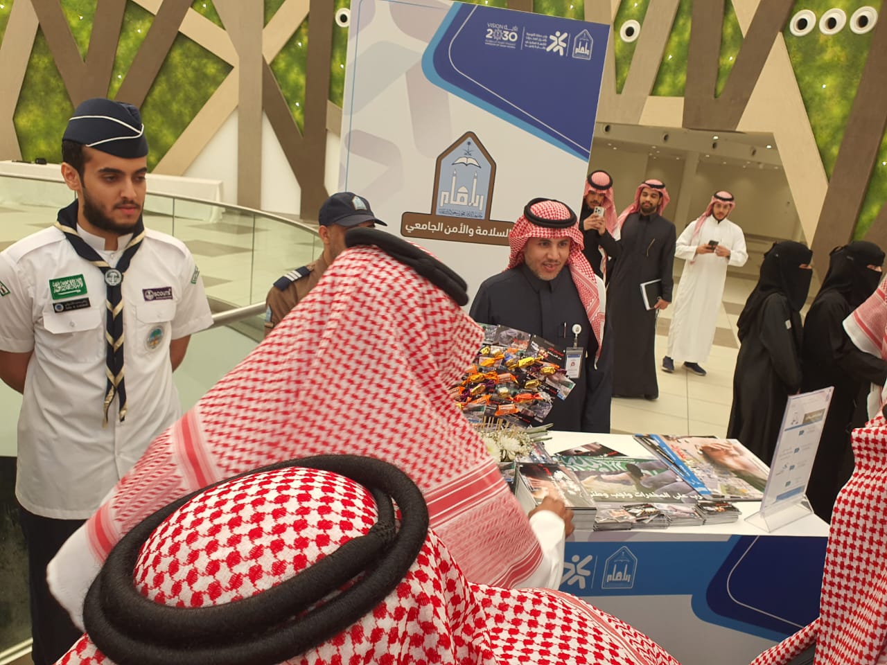 The General Administration for Safety and University Security participated in a booth at the "Bader" exhibition, aimed at raising awareness about the dangers of drugs and psychoactive substances. The event was organized by the Deanship of Student Affairs in partnership with 27 governmental, private entities, charitable organizations, and student clubs at the university, taking place on Tuesday and Wednesday, corresponding to the 13th and 14th of Jumada Al-Akhira in the year 1445 AH, in the main hall of the university campus, and was inaugurated by the university president.