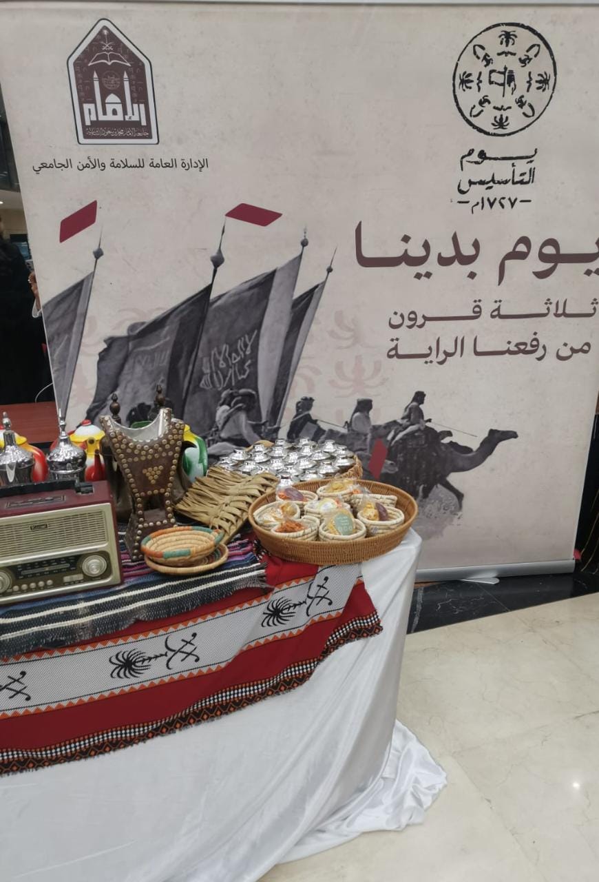 As part of King Abdullah Economic City for Female Students' participation in the celebration of Saudi Foundation Day. Which was launched by the Vice Rector for Female Student Affairs, Dr. Nawaf Al-Ajmi, on Tuesday, 1/08/1444 AH, in the lobby of Building 416, the General Administration of Safety and University Security, represented by the Women's Security Department, participated with a booth at the exhibition.