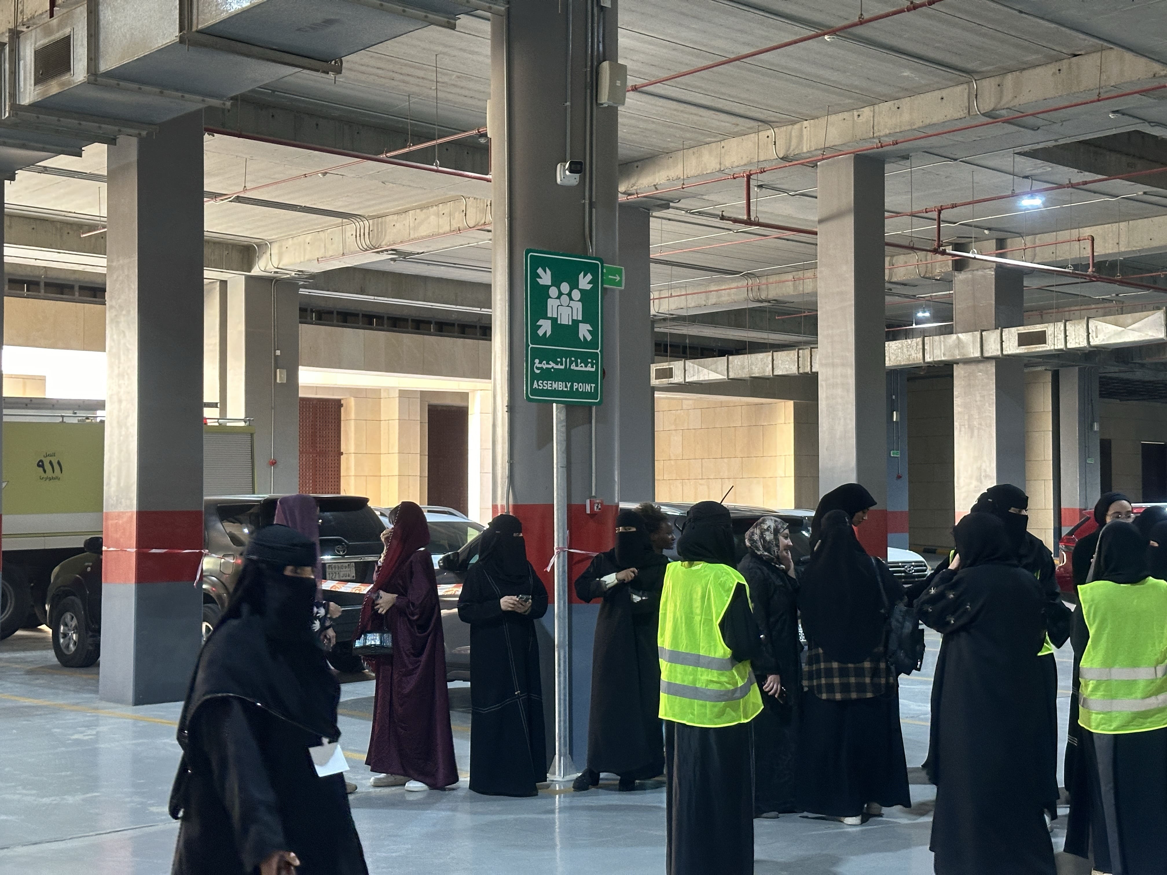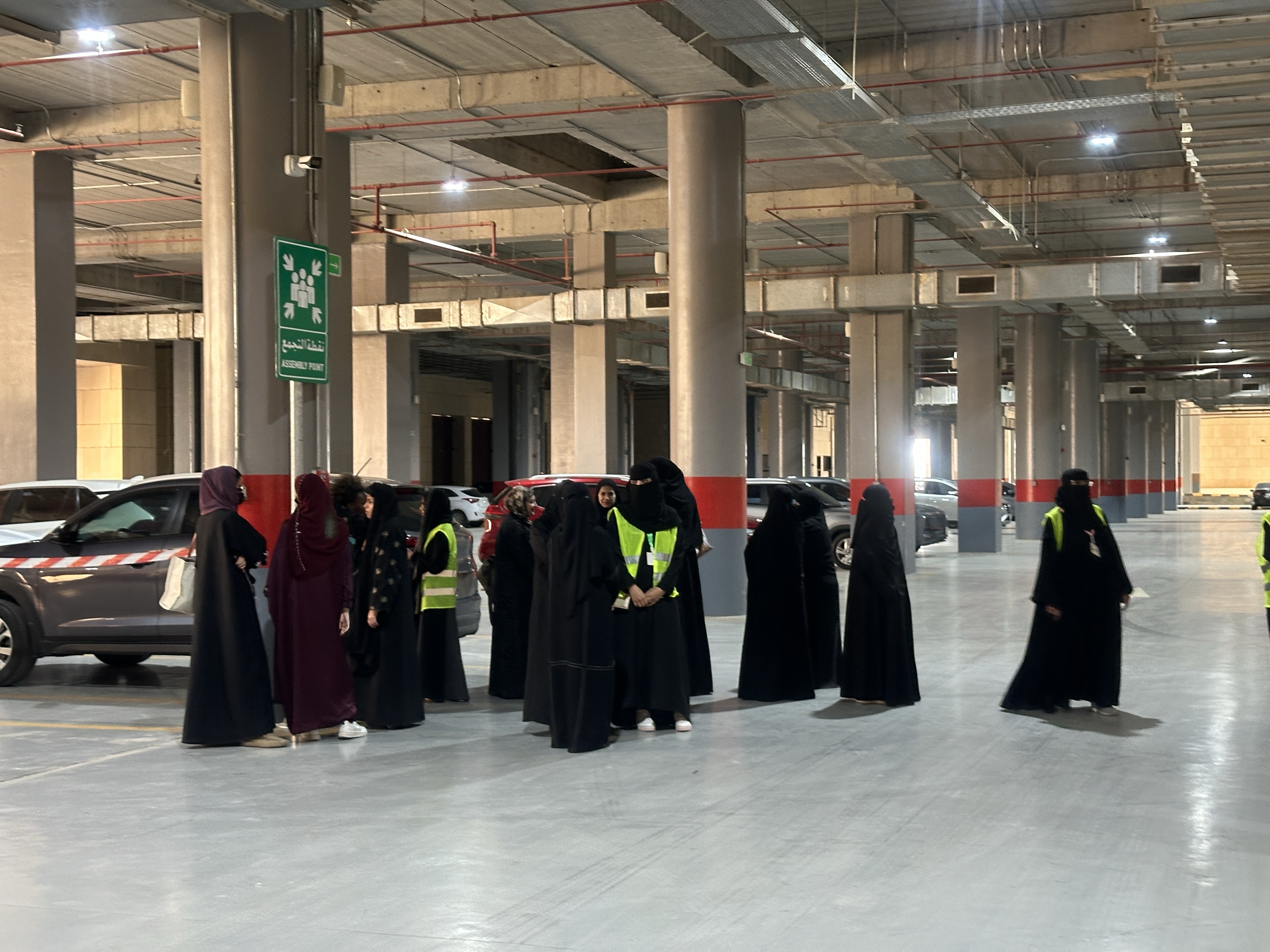 The General Administration of University Safety and Security carried out a periodic virtual evacuation plan at King Abdullah City for Female Students in Building 411 on Thursday, 16/05/1445 AH, under the supervision of the Civil Defense and with the participation of relevant authorities.