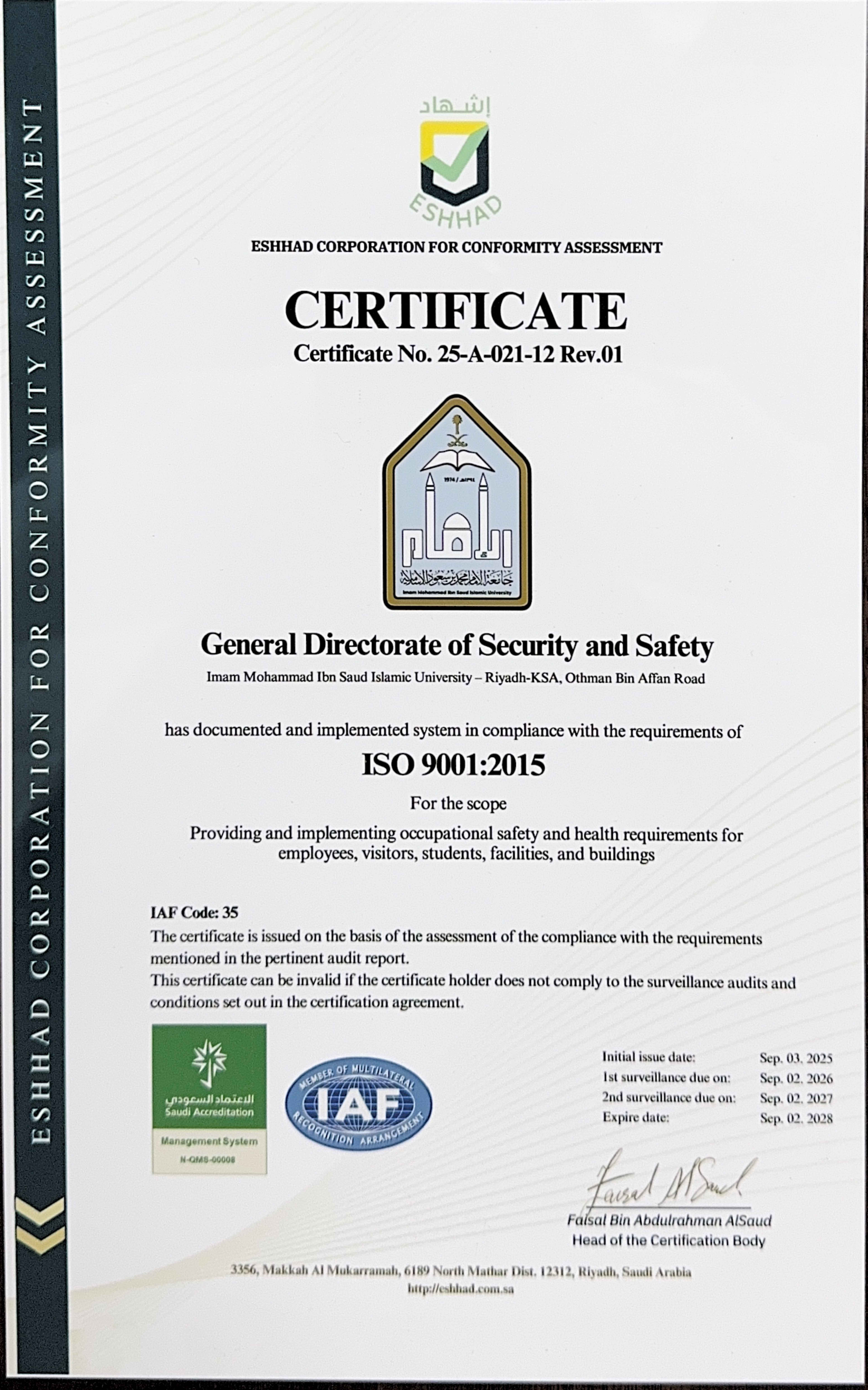 حققت الإدارة العامة للأمن والسلامة شهادتي المواصفات القياسية iso 9001 – iso 45001 جاء ذلك في الاحتفال المقام في مبنى المؤتمرات بجامعة الإمام محمد بن سعود الإسلامية يوم الأربعاء 1 / 10 /2025م برعاية معالي رئيس جامعة الإمام محمد بن سعود الإسلامية أ.د أحمد سالم العامري وذلك ضمن مبادرات الخطة الإستراتيجيّة للجامعة 2025م.