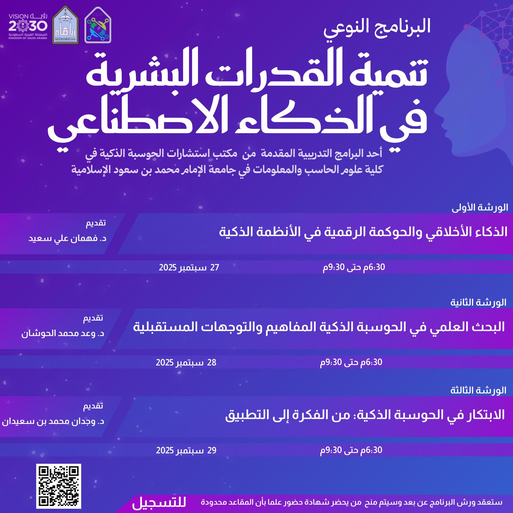 تعلن الكلية عن البرنامج النوعي لتنمية القدرات البشرية في الذكاء الاصطناعي، وهو أحد البرامج التدريبية التي يقدمها مكتب استشارات الحوسبة الذكية في كلية علوم الحاسب والمعلومات بجامعة الإمام محمد بن سعود الإسلامية.