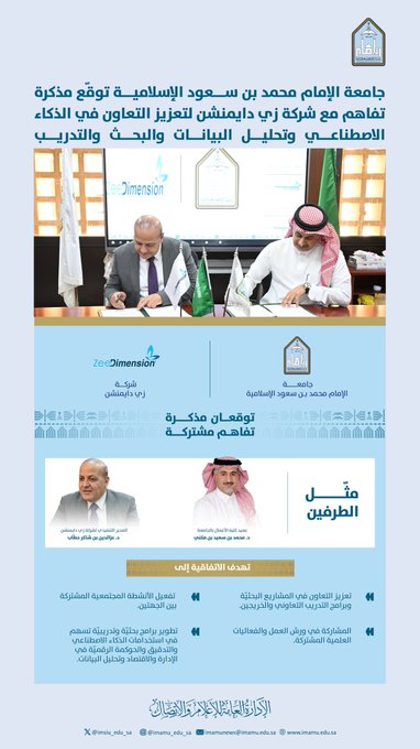 وقّعت جامعة الإمام محمد بن سعود الإسلامية ممثلةً في كلية الأعمال اليوم الأحد 2 / 11 / 2025م مذكرة تفاهم مع شركة زي دايمنشن، بهدف تعزيز مجالات التدريب التعاوني وبرامج الخريجين، وتطوير مشاريع بحثية وتطبيقية في الذكاء الاصطناعي وتحليل البيانات والحوكمة الرقمية.