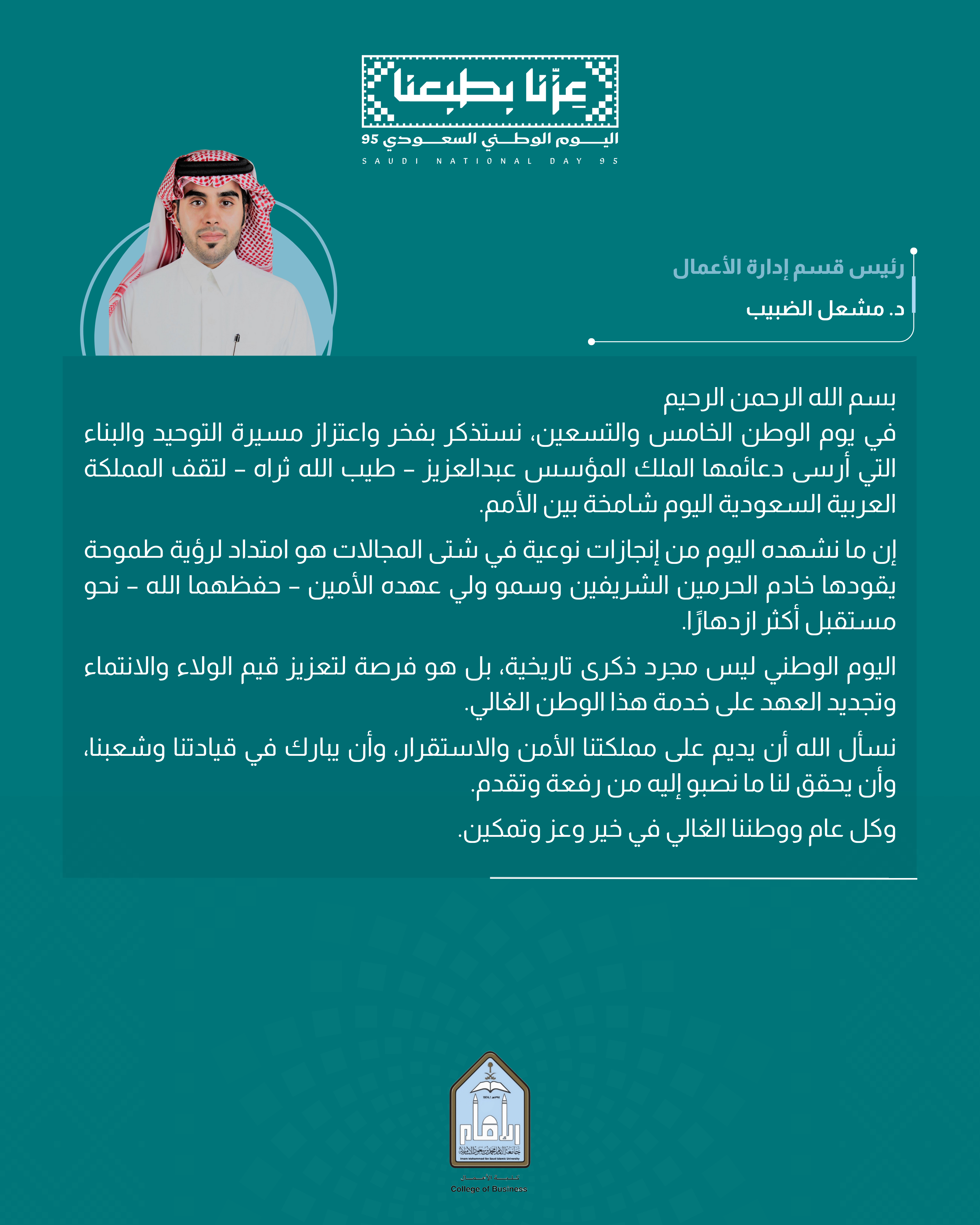 كلمة رئيس قسم إدارة الأعمال د. مشعل الضبيب بمناسبة اليوم الوطني السعودي 95