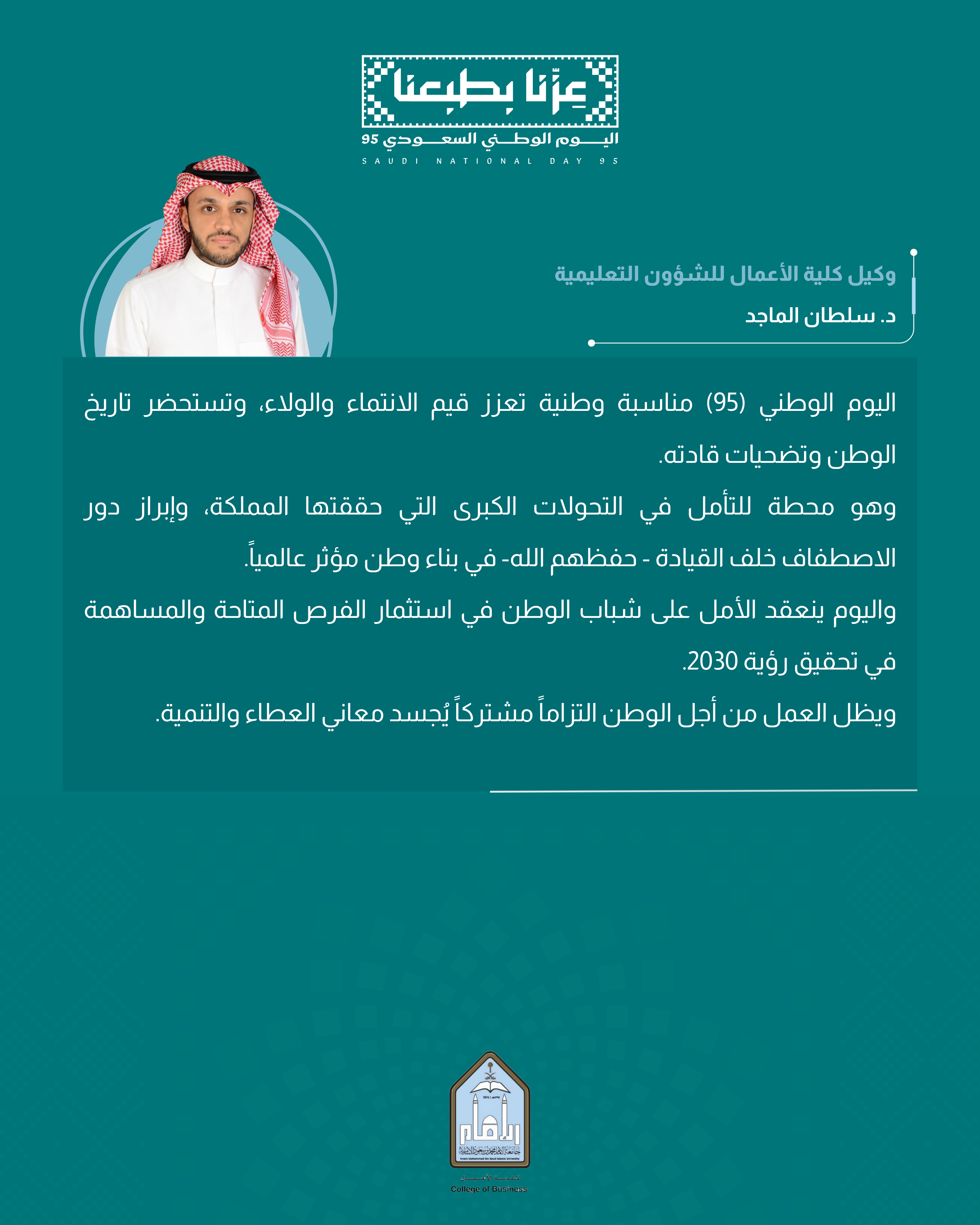 كلمة وكيل كلية الأعمال للشؤون التعليمية د. سلطان الماجد بمناسبة اليوم الوطني السعودي 95