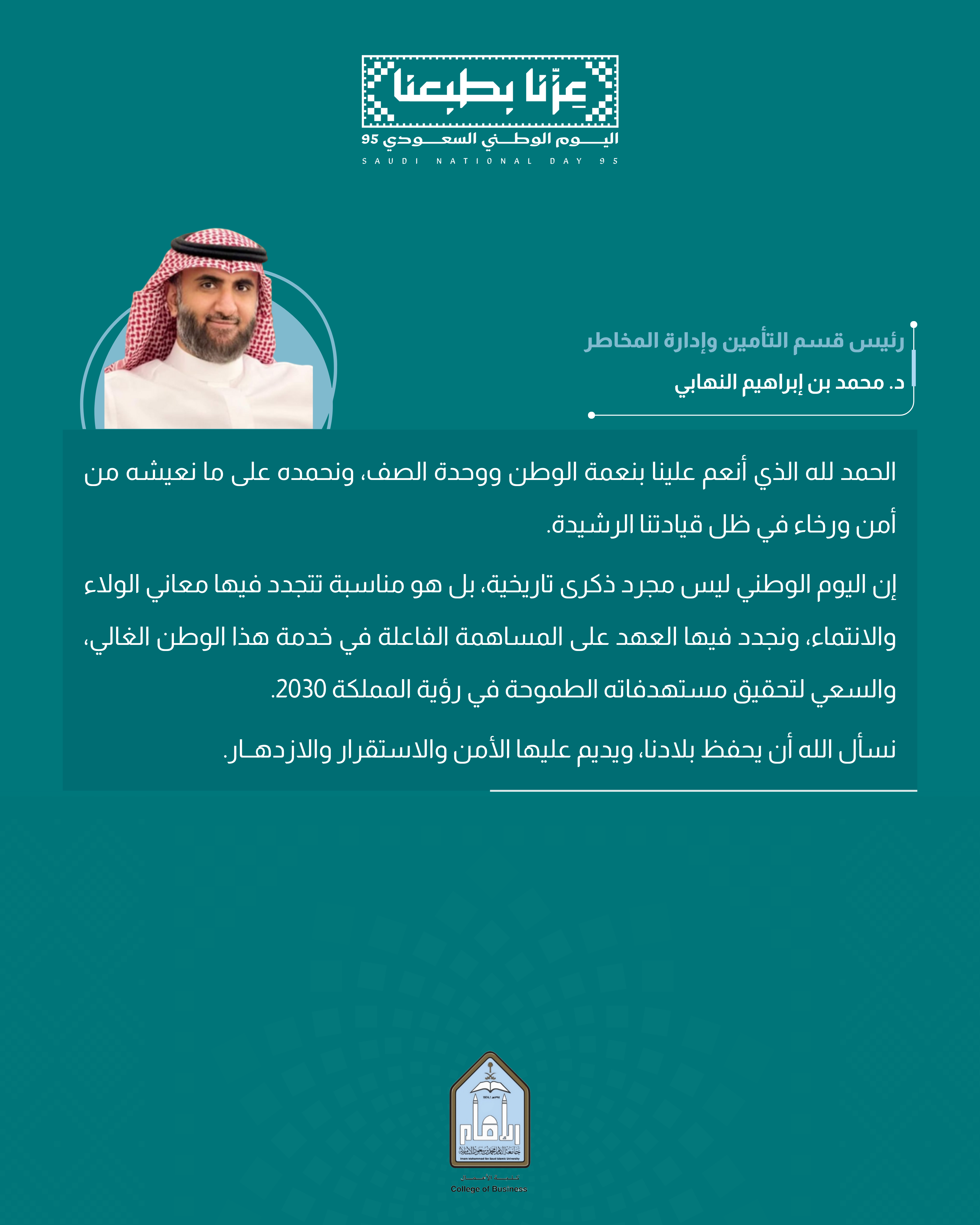كلمة رئيس قسم التأمين وإدارة المخاطر د. محمد بن إبراهيم النهابي بمناسبة اليوم الوطني السعودي 95.