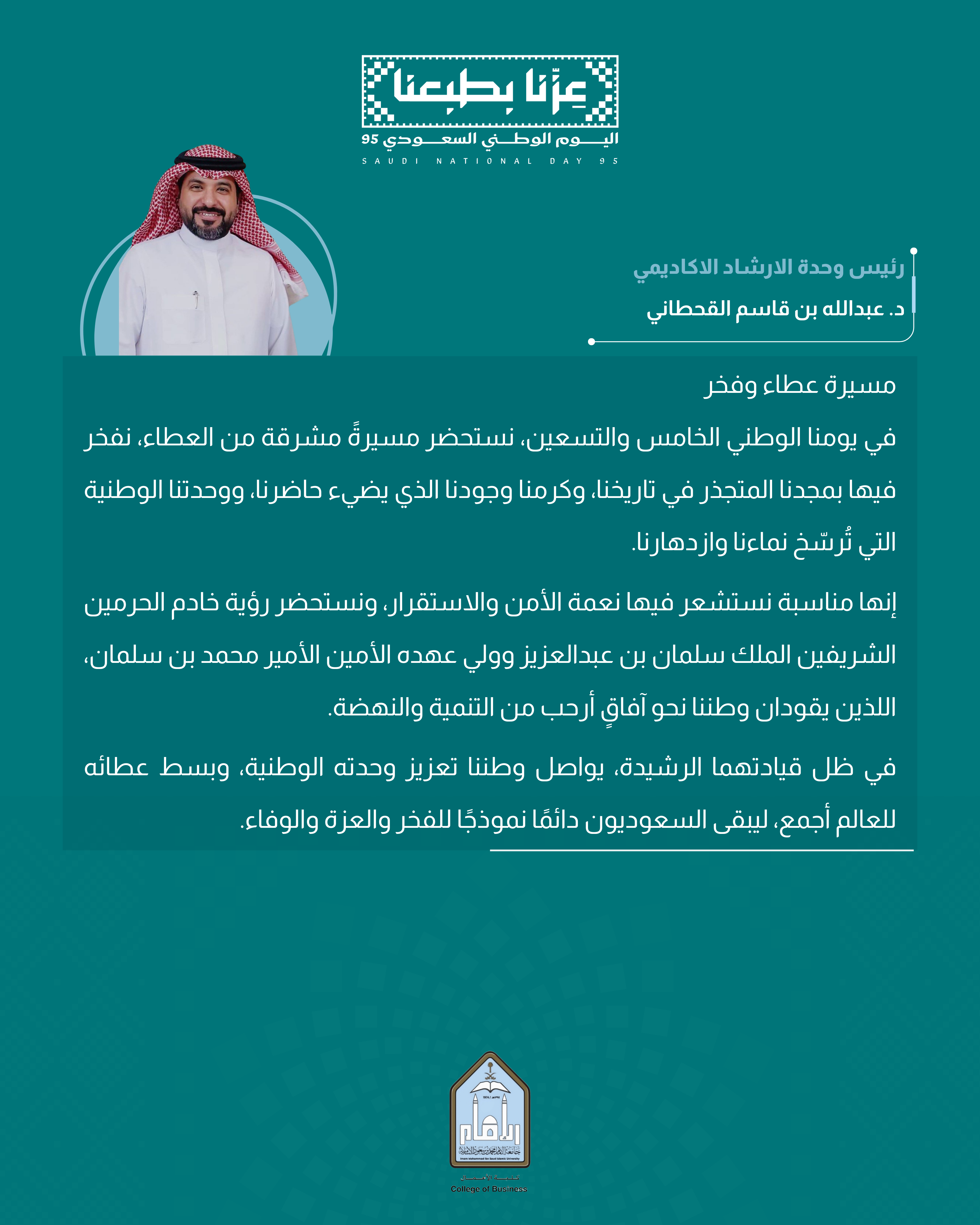 كلمة رئيس وحدة الإرشاد الأكاديمي د. عبد الله بن قاسم القحطاني بمناسبة اليوم الوطني السعودي 95