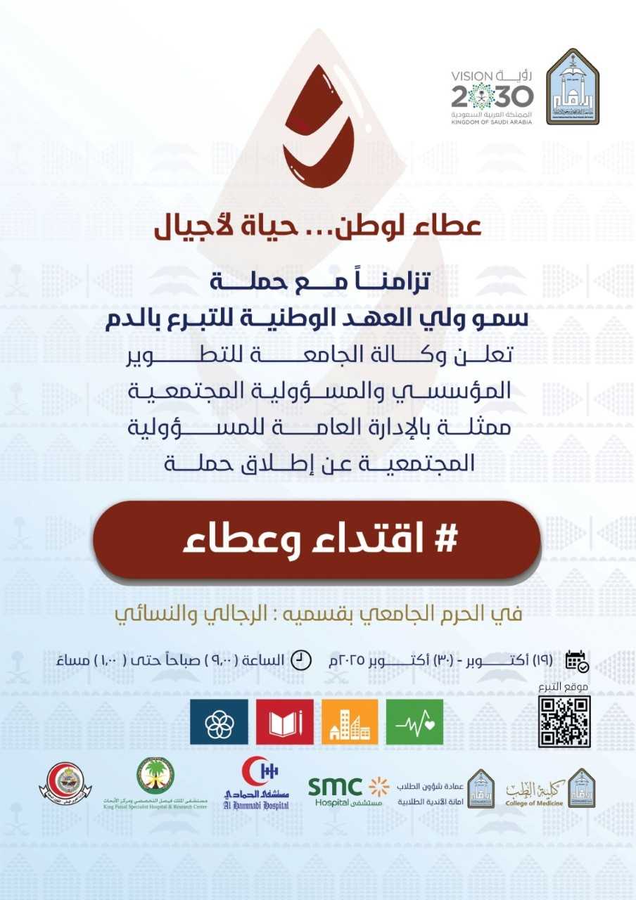 وتدعو الإدارة العامة للمسؤولية المجتمعية جميع منسوبي وطلبة الجامعة للمشاركة في هذه الحملة الإنسانية
