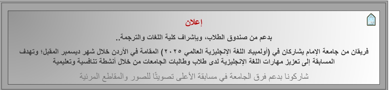 فريقان من جامعة الإمام يشاركان في أولمبياد اللغة الإنجليزية العالمي 2025 المقامة في الأردن خلال شهر ديسمبر