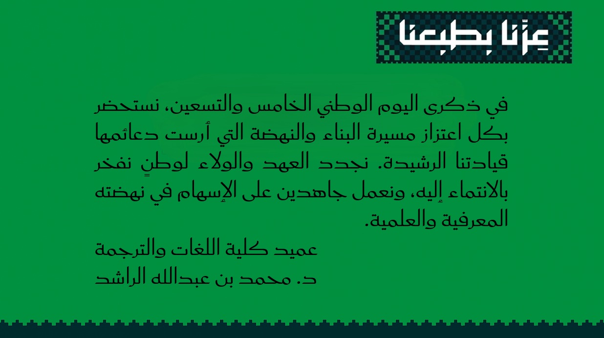 كلية اللغات والترجمة تحتفي باليوم الوطني الـ95 العميد يؤكد “أنتم جيل اللغة والتواصل وحَمَلة رسالة الانفتاح المسؤول”