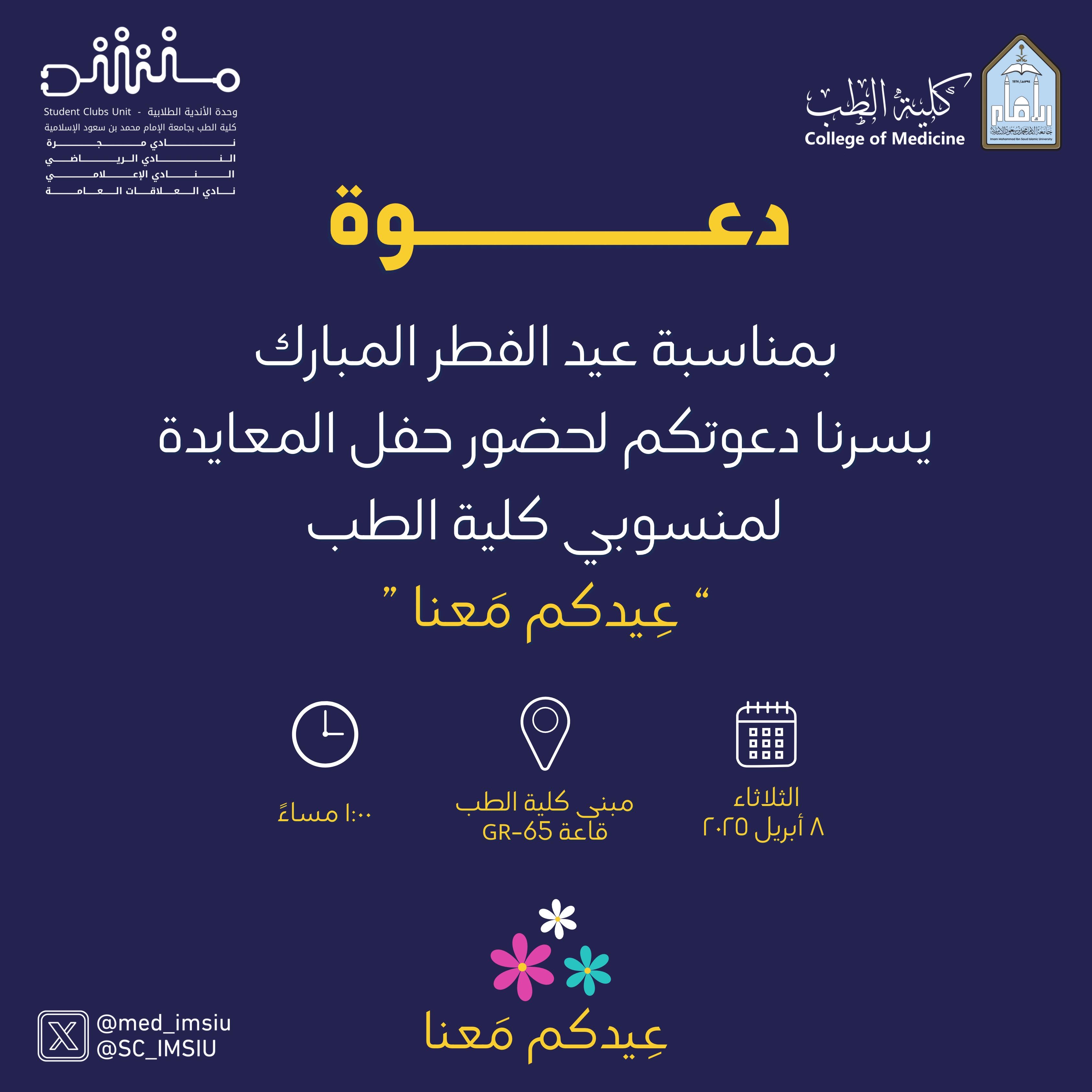 يسر كلية الطب بجامعة الإمام دعوتكم لحضور حفل معايدة عيد الفطر المبارك ،