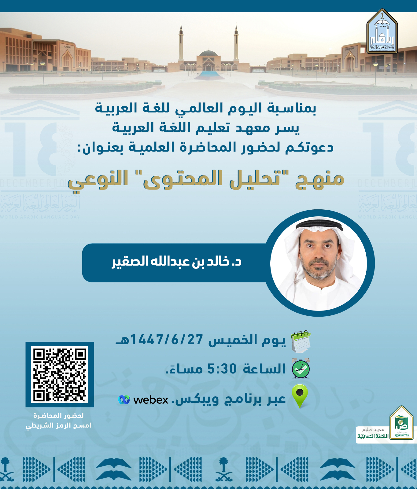 بمناسبة اليوم العالمي للغة العربية المعهد يقيم محاضرة علمية بعنوان (منهج تحليل المحتوى النوعي)