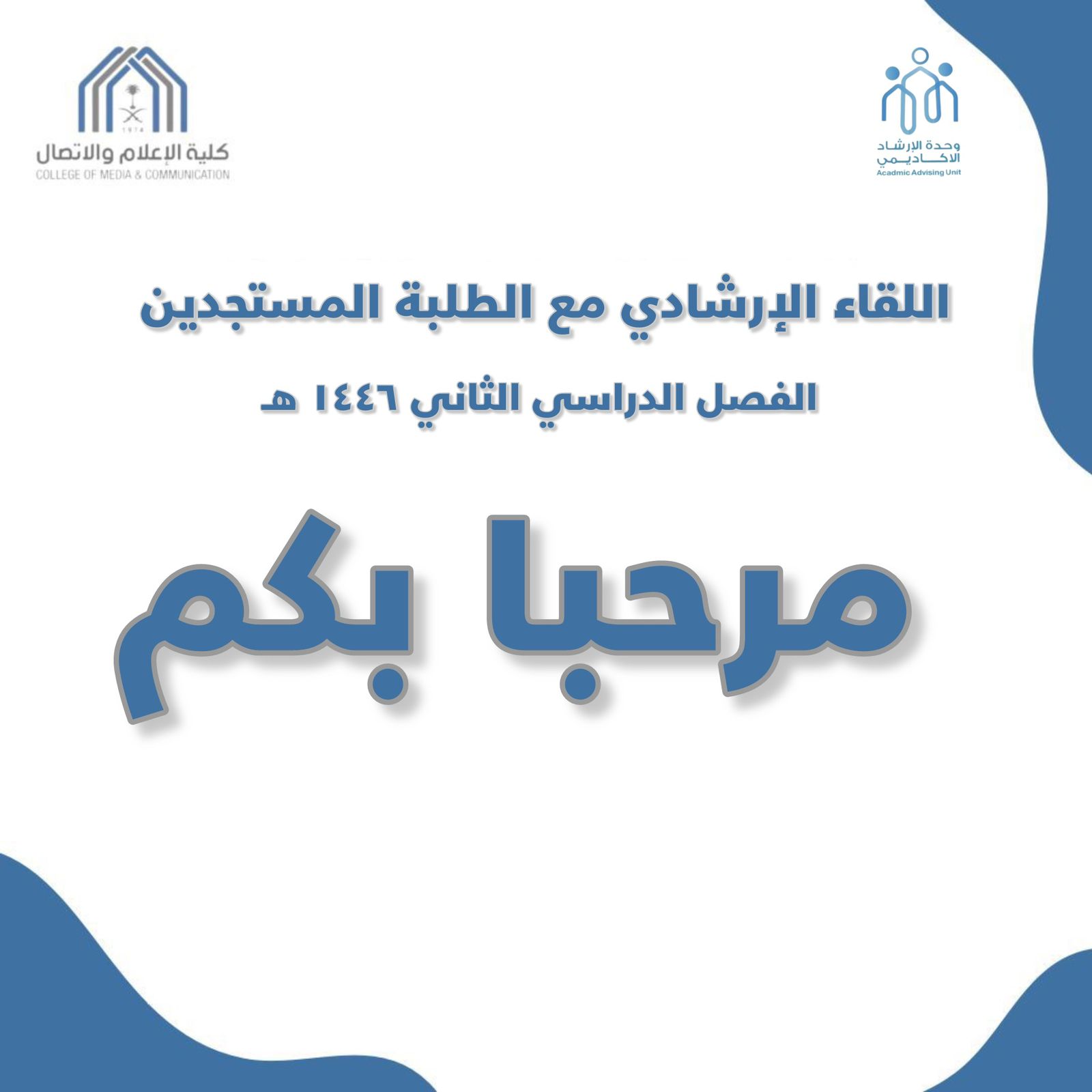 استقبلت كلية_الإعلام_والاتصال، طلابها المُستجدين للفصل الدراسي الثاني للعام الجامعي ١٤٤٦ هـ، باللقاء الإرشادي المُعتاد مع سعادة عميد الكلية الدكتور سعود السهلي، و رئيس وحدة الإرشاد الطلابي الدكتور علي الحنايا، والمرشد الأكاديمي للكلية الأستاذ صالح المحيميد.