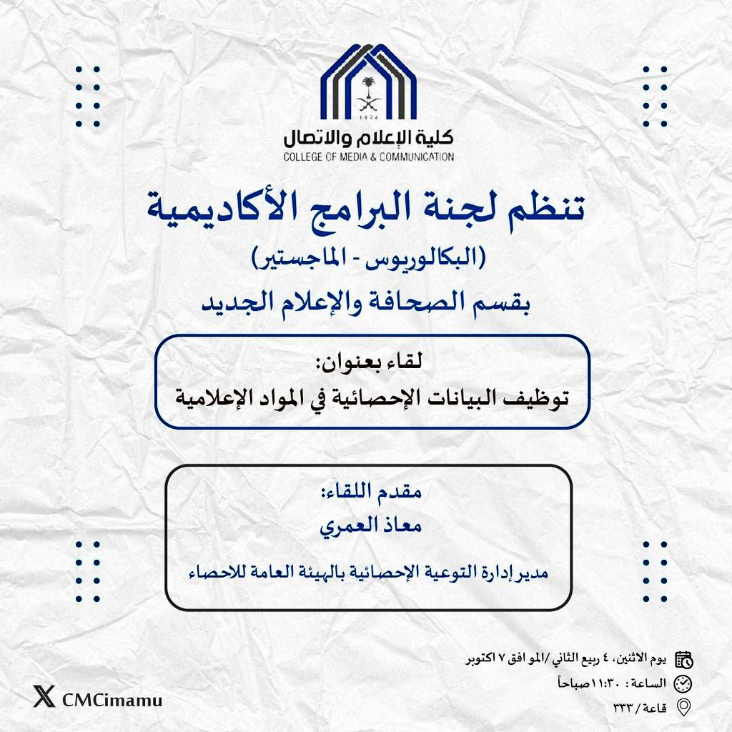 ثم ألقى مدير إدارة التوعية الإحصائية محاضرة لمنسوبي الكلية، عن توظيف البيانات الإحصائية في الدراسات الإعلامية حضرها عدد من أعضاء هيئة التدريس والطلاب والمهتمين من خارج الكلية.
