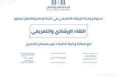 تدعو وحدة الإرشاد الأكاديمي بـكلية الإعلام والاتصال الطالبات المستجدات لحضور اللقاء التعريفي للطالبات المستجدات للعام الجامعي 1447هـ، للتعريف باللوائح والخطط الدراسية والإجابة على الاستفسارات.
