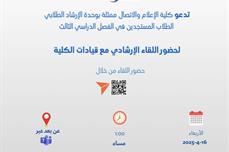 نظمت كلية الإعلام والاتصال ممثلة بوحدة الإرشاد الطلابي لقاء المستجدين للفصل الدراسي الثالث مع قيادات الكلية بحضور سعادة وكيل الكلية للشؤون التعليمية الدكتور طارق الشدوخي، و رئيس وحدة الإرشاد الطلابي الدكتور علي الحنايا ورؤساء لجان الإرشاد الأكاديمي في الأقسام العلمية والمرشد الأكاديمي للكلية الأستاذ صالح المحيميد.