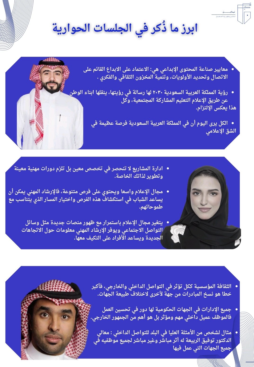 واشتمل الملتقى على سلسلة من الورش التدريبية التفاعلية والجلسات الحوارية في مجالات دور الإعلام في التعريف ببرامج ومشروعات رؤية المملكة والريادة الإعلامية والتطورات التقنية، وتنظيم الفعاليات، والإرشاد المهني والاتصال المؤسسي، حيث شارك في الملتقى عدد كبير من المتخصصين والخبراء والمهتمين من داخل الكلية وخارجها.