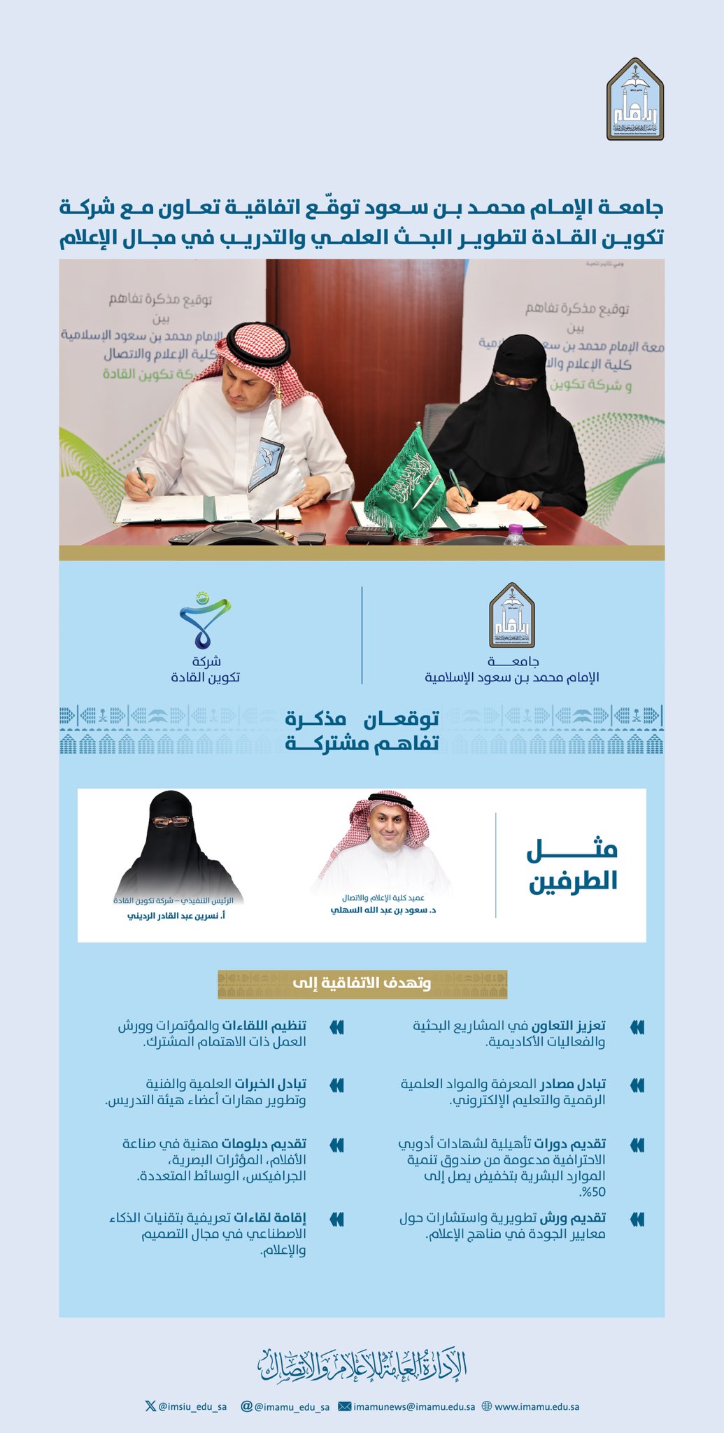 وقْعت كلية الإعلام والاتصال ممثلة في وحدة التسويق والأعمال والمسؤولية المجتمعية، اتفاقية شراكة وتعاون مع مركز تكوين القادة للتدريب وذلك لتعزيز سبل التعاون المشترك في مجالات التدريب والتطوير والابتكار والاستشارات، وقد مثّل الجامعة في توقيع المذكرة سعادة عميد الكلية د. سعود بن عبد الله السهلي فيما مثّل مركز تكوين القادة سعادة الرئيس التنفيذي أ. نسرين الرديني .