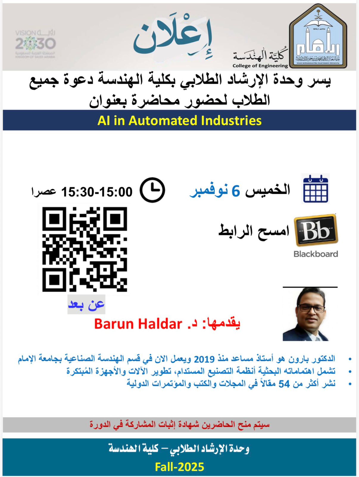 The seminar will be delivered by Dr. Barun Haldar, a faculty member in the Department of Industrial Engineering at Imam Mohammad Ibn Saud Islamic University. Dr. Haldar, who has been serving at the university since 2019, specializes in intelligent manufacturing systems, automation, and the development of smart machines and devices. He has published over 54 research papers in international journals, books, and conferences.