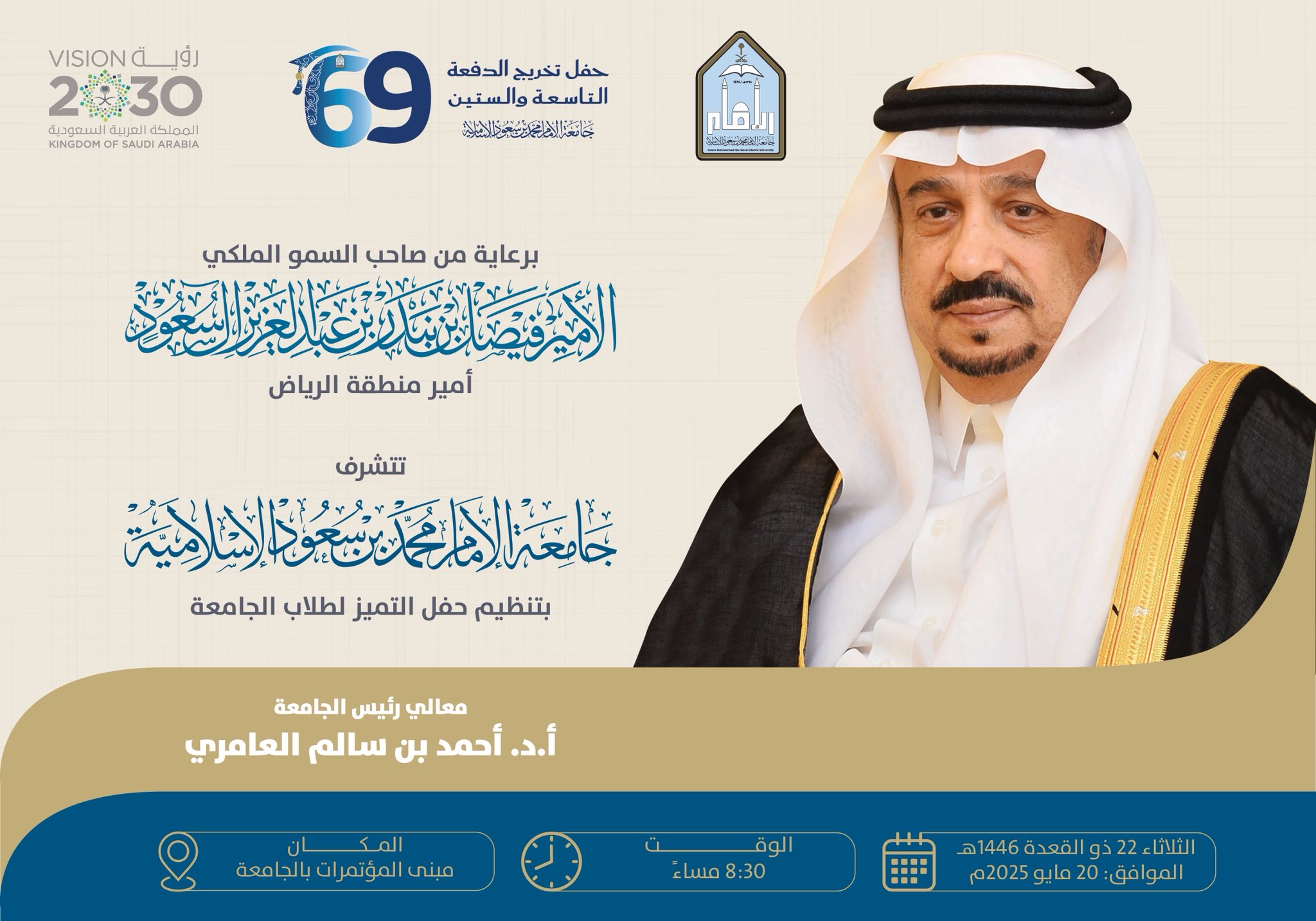 Under the patronage of His Royal Highness Prince Faisal bin Bandar bin Abdulaziz Al Saud, Imam Muhammad Ibn Saud Islamic University is honored to organize the graduation ceremony for the sixty-ninth batch of students.
