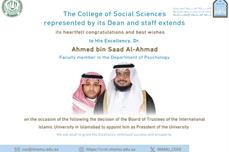 The Dean of the College of Social Sciences, Dr. Faisal bin Mohammed Al-Muhareb, and the faculty members extend their heartfelt congratulations and best wishes to Dr. Ahmed bin Saad Al-Ahmed, a faculty member in the Department of Psychology, on the issuance of the decision appointing him as the President of the International Islamic University in Islamabad, Pakistan, wishing him continued success.