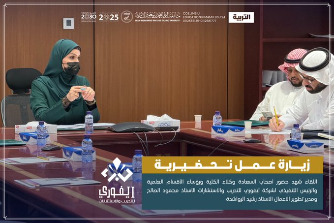 عقدت كلية التربية اجتماعًا مع وفد من شركة ايفوري للتدريب والاستشارات، برئاسة سعادة وكيلة الكلية لشؤون الطالبات الدكتورة الهنوف بنت عبيد الشمري، نيابةً عن سعادة عميد الكلية، وذلك في إطار جهود الكلية الرامية إلى تعزيز الشراكات المهنية وتوسيع آفاق التعاون مع مؤسسات التدريب المؤسسي.
