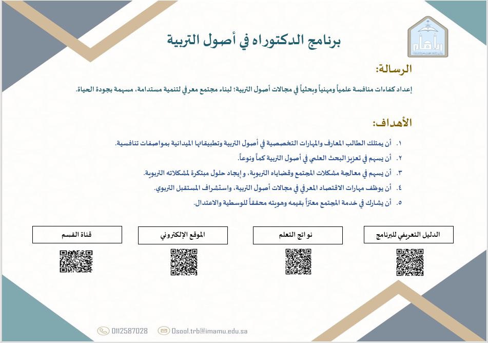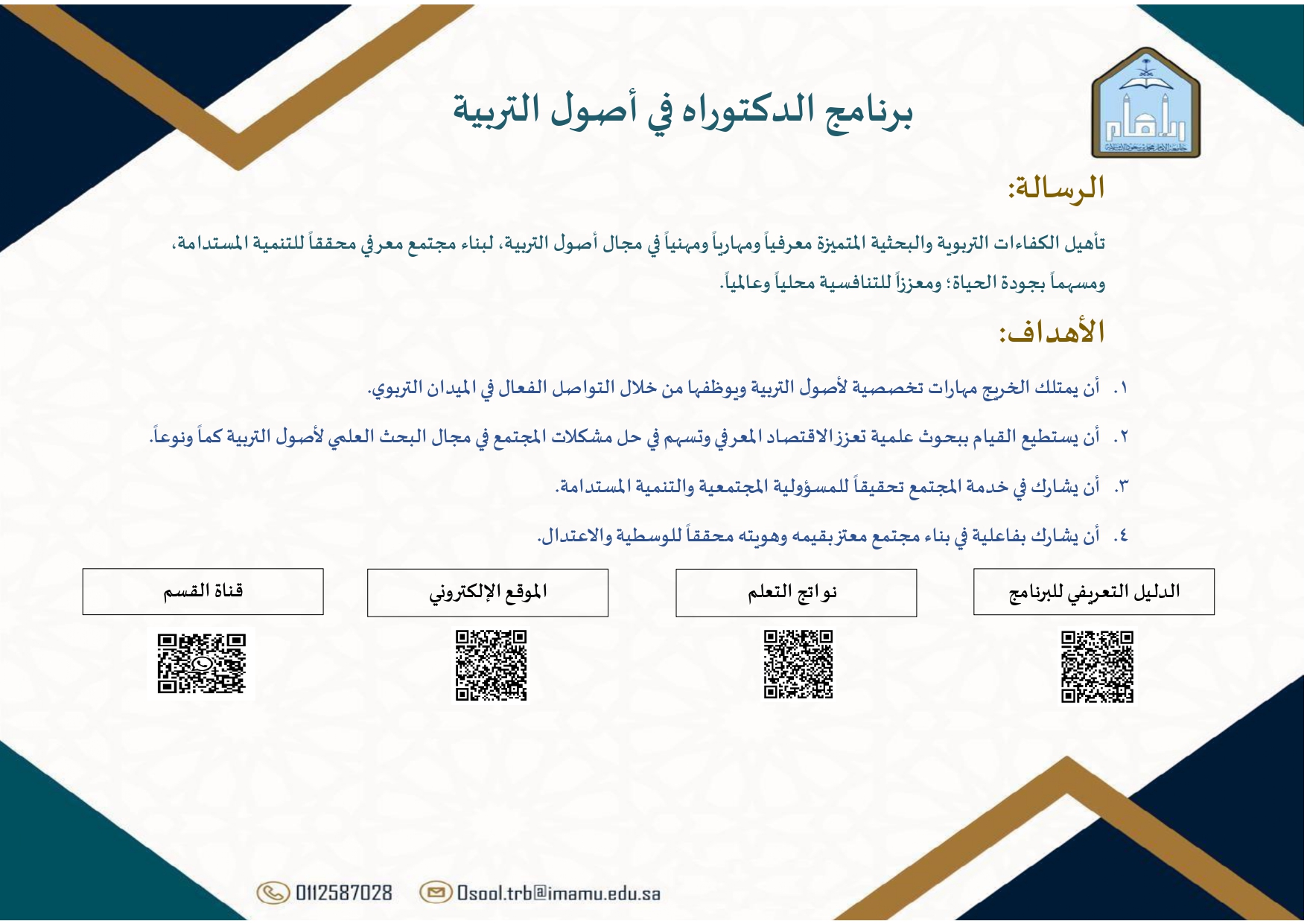 إعداد كفاءات منافسة علمياً ومهنياً وبحثياً في مجالات أصول التربية؛ لبناء مجتمع معرفي لتنمية مستدامة، مسهمة بجودة الحياة.