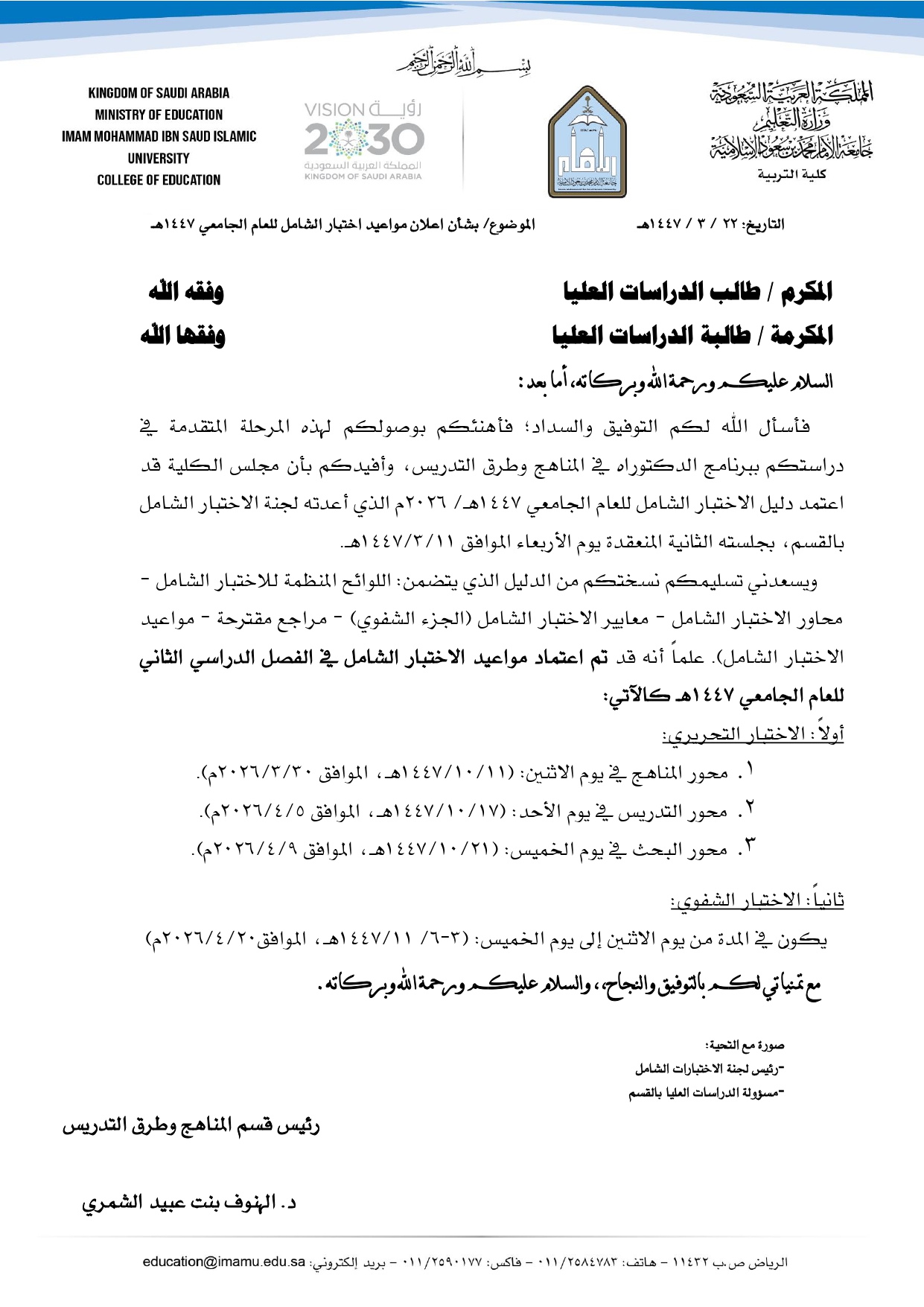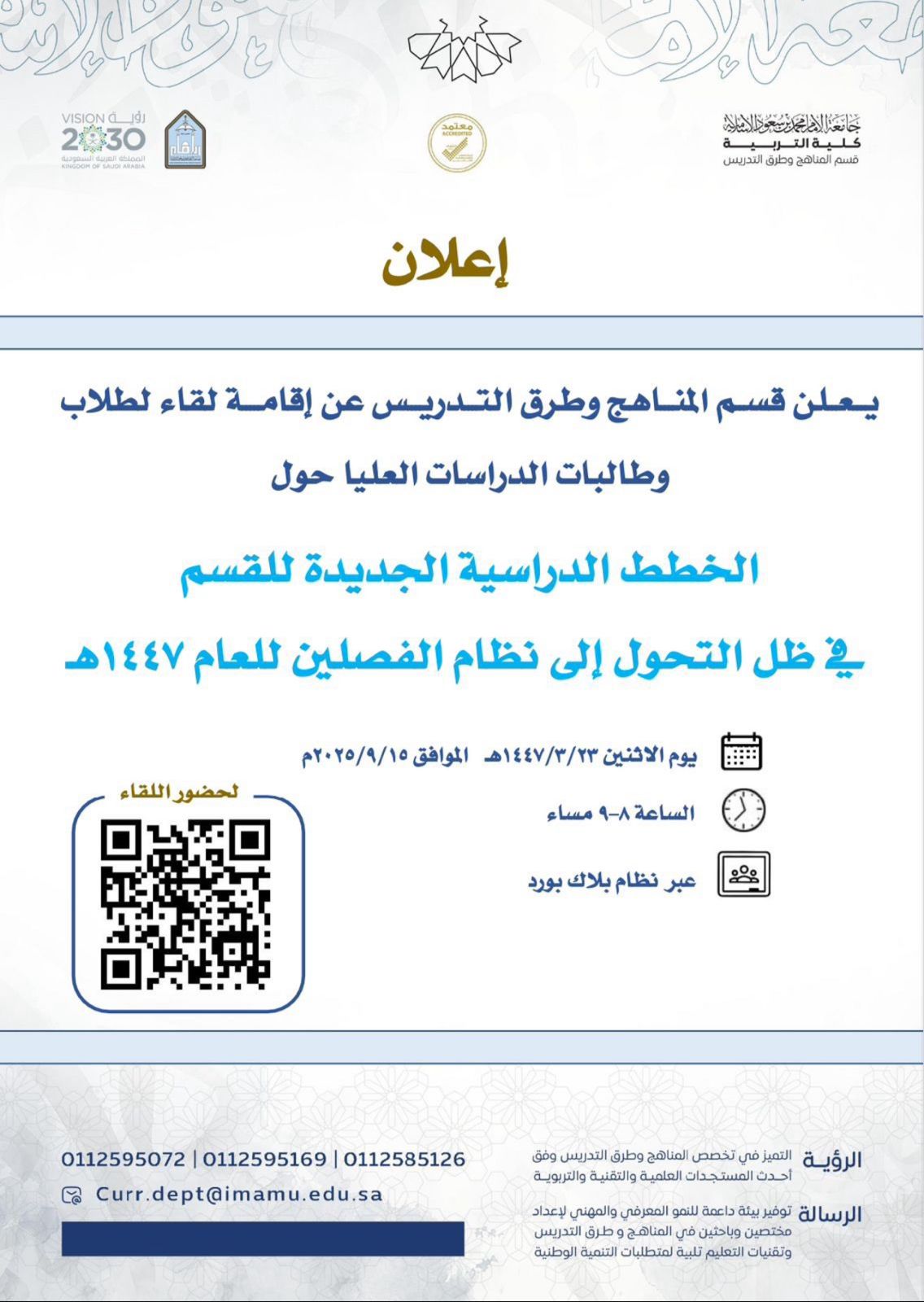 إعلان جدول الإختبارات النهائية لقسم المناهج وطرق التدريس الفصل الدراسي الثاني عام 1446هـ