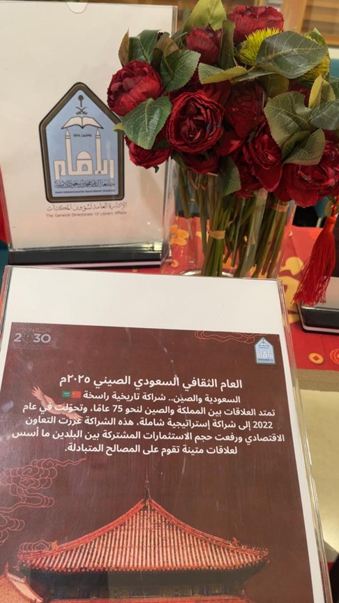 قام نادي المكتبة بـ الإدارة العامة لشؤون المكتبات ركنًا ثقافيًا ضمن فعاليات العام الثقافي السعودي الصيني 2025م، وذلك في إطار تعزيز التبادل الثقافي، وترسيخ قيم التواصل الحضاري بين المملكة العربية السعودية وجمهورية الصين الشعبية، واشتمل الركن على عددٍ من المواد التعريفية، والمحتوى الثقافي الذي يبرز ملامح الثقافة السعودية والصينية، ويعكس عمق العلاقات الثنائية والتقارب الحضاري بين البلدين، إضافة إلى تعريف الزوار بأدوار المكتبات في دعم المعرفة والانفتاح الثقافي ، وتأتي هذه المشاركة تأكيدًا لحرص الإدارة العامة لشؤون المكتبات على الإسهام في الفعاليات الثقافية، وتعزيز دور المكتبات كمنصات معرفية تسهم في نشر الوعي الثقافي وبناء جسور التواصل بين الشعوب.