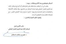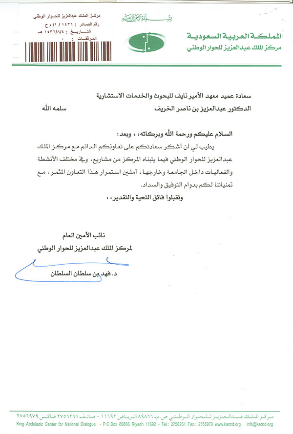 تلقى عميد المعهد د.عبدالعزيز بن ناصر الخريف خطاب شكر وتقدير من سعادة نائب الأمين العام لمركز الملك عبدالعزيز للحوار الوطني د.فهد بن سلطان السلطان، والذي جاء فيه: "أشكركم على تعاونكم الدائم مع مركز الملك عبدالعزيز للحوار الوطني فيما يتبناه المركز من مشاريع، وفي مختلف الأنشطة والفعاليات داخل الجامعة وخارجها".