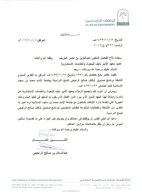 ​ عبر سعادة الأستاذ/ عبدالسلام بن صالح الراجحي، الأمين العام لمجلس أمناء أوقاف صالح عبدالعزيز الراجحي، عن شكره وتقديره لمعهد الأمير نايف للبحوث والخدمات الاستشارية، على ما قدمه خلال العام الماضي 1432/1433هـ من تميز في إدارة برنامج أوقاف صالح الراجحي للمنح الدراسية، وإقامة الفعاليات، والأنشطة المتنوعة لطلاب البرنامج.