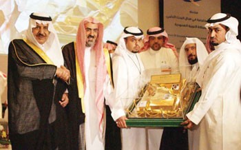 وفي الختام، كرم سمو الأمير نايف بن عبدالعزيز ممولي كراسي البحث بالجامعة ورعاة المنتدى، ثم تسلم سموه هدية تذكارية من معالي مدير جامعة الإمام محمد بن سعود الإسلامية.
