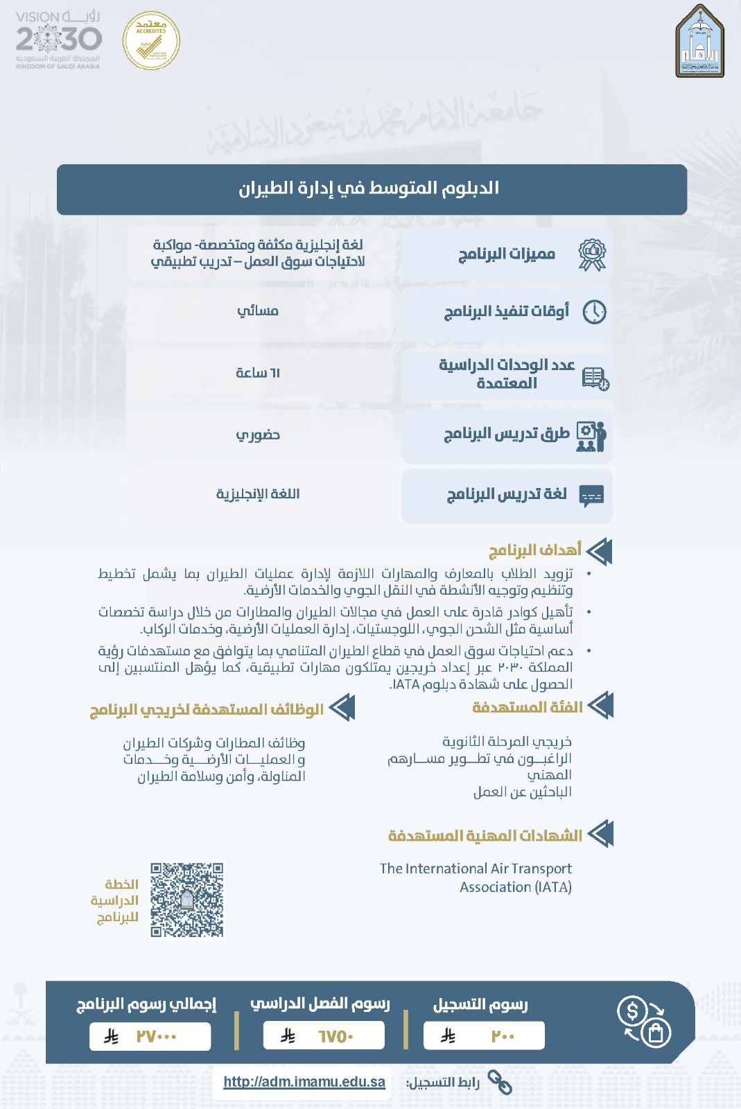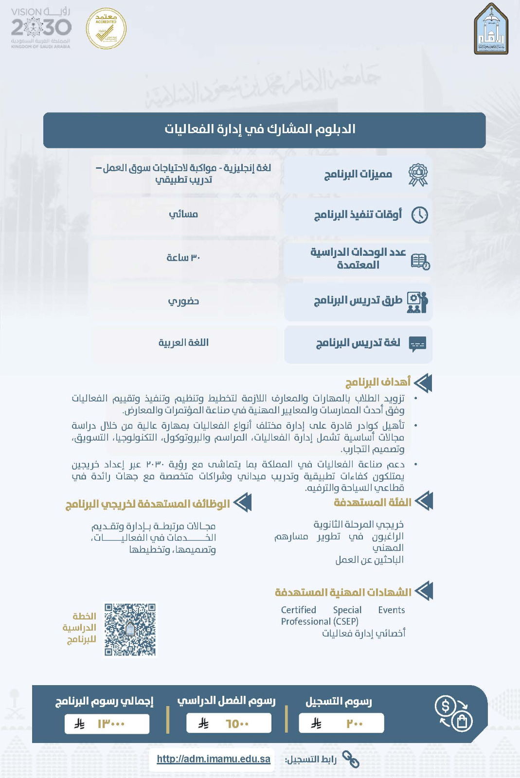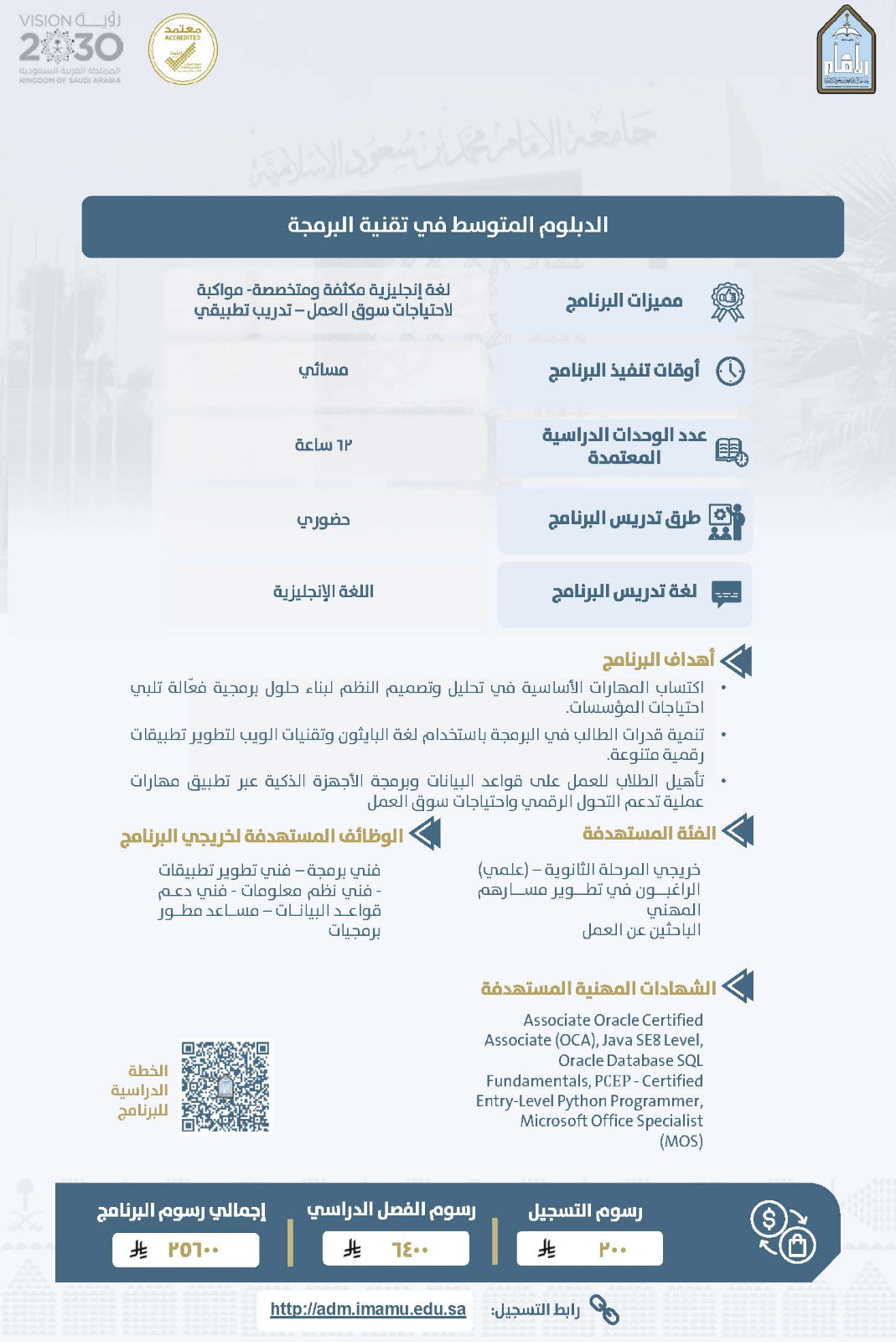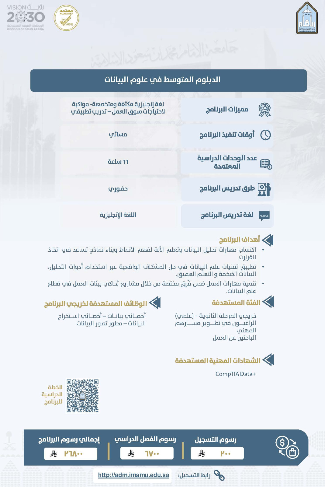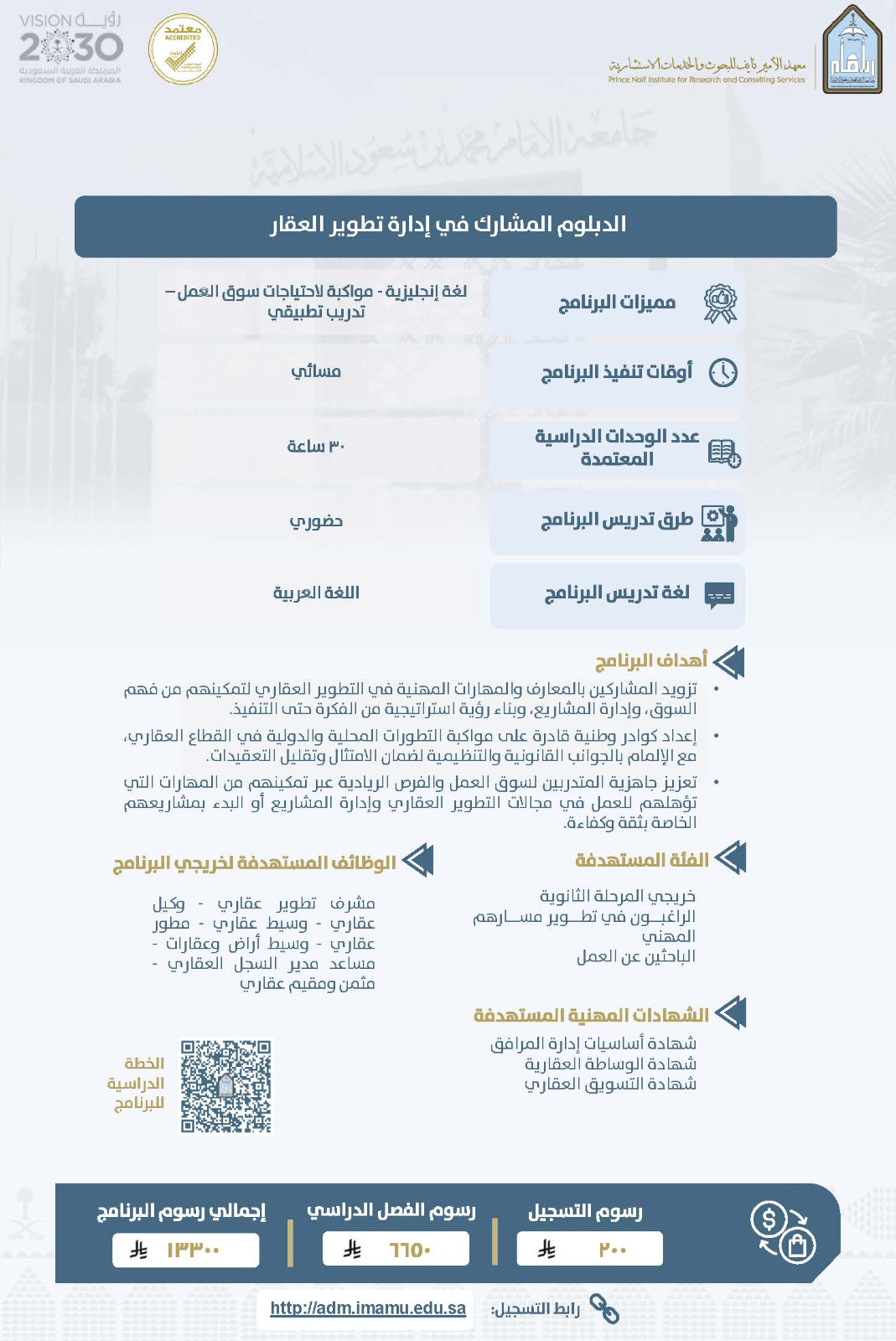 يعلن معهد الأمير نايف للبحوث والخدمات الاستشارية بجامعة الإمام محمد بن سعود الإسلامية عن فتح باب القبول في عدد من برامج الدبلوم المدفوع للفصل الدراسي الثاني من العام الجامعي 1447هـ، وذلك ضمن جهوده في تقديم برامج نوعية تلبي احتياجات سوق العمل، وتسهم في تطوير المهارات المهنية للطلاب والطالبات.