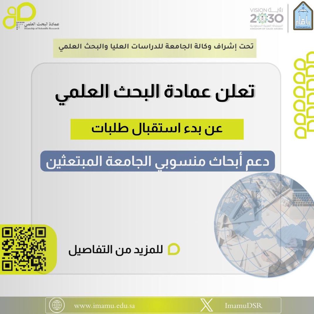 عمادة البحث العلمي بـجامعة الإمام محمد بن سعود الإسلامية تعلن عن بدء استقبال طلبات دعم أبحاث منسوبي الجامعة المبتعثين