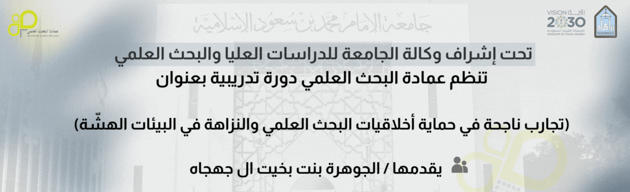 عمادة البحث العلمي تعلن عن تنظيم دورة تدريبية بعنوان (تجارب ناجحة في حماية أخلاقيات البحث العلمي والنزاهة في البيئات الهشّة)
