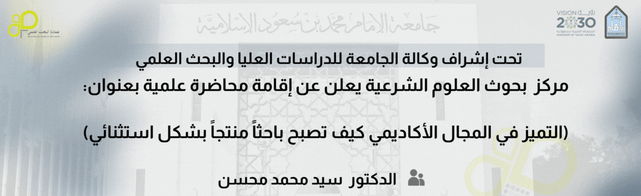 مركز بحوث العلوم الشرعية يعلن عن إقامة محاضرة علمية بعنوان: (التميز في المجال الأكاديمي كيف تصبح باحثاً منتجاً بشكل استثنائي ؟)