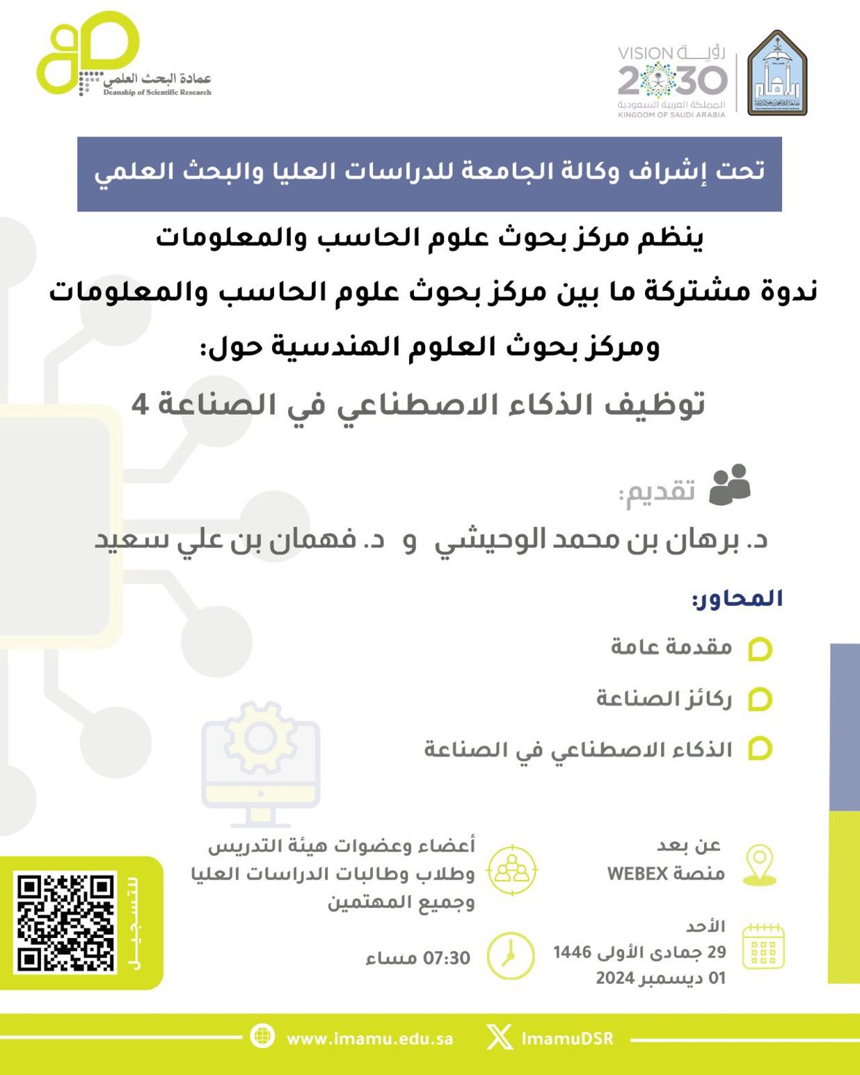 تعلن عمادة البحث العلمي بـ #جامعة_الإمام عن إقامة ندوة علمية مشتركة مابين مركز بحوث علوم الحاسب والمعلومات ومركز بحوث العلوم الهندسية حول: (توظيف الذكاء الاصطناعي في الصناعة 4) يقدمها كلاً من الدكتور برهان الوحيشي و الدكتور فهمان سعيد، وذلك يوم الأحد الموافق ٢٠٢٤/١٢/٠١