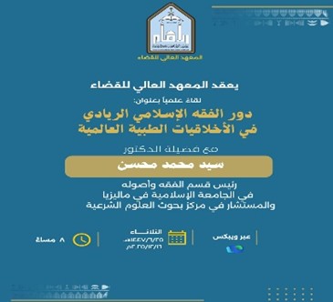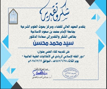 وفي المساء، قدّم المستشار العلمي محاضرة لأساتذة وطلاب الدراسات العليا في المعهد العالي للقضاء بعنوان: “دور الفقه الإسلامي الريادي في الأخلاقيات الطبية العالمية”، ناقش خلالها مساهمة الفقه الإسلامي ومقاصد الشريعة في النقاشات العالمية، مع التركيز على حفظ النفس، ودور الأسرة والمجتمع في تعزيز الأخلاقيات، مقارنة بالقيم الفردية في الأطر الغربية.