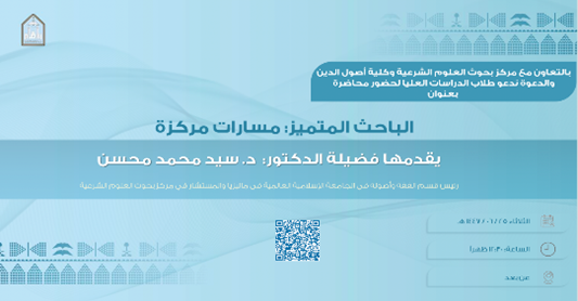 كما قدّم المستشار العلمي محاضرة لطلاب الدراسات العليا بكلية أصول الدين بعنوان: “الباحث المتميّز: مسارات مركّزة”، حيث استعرض أهمية المسارات البحثية المركّزة، أثرها في تطوير الباحث وزيادة الإنتاجية الأكاديمية، وأبرز النماذج وآليات التخطيط لمسارات بحثية ناجحة.