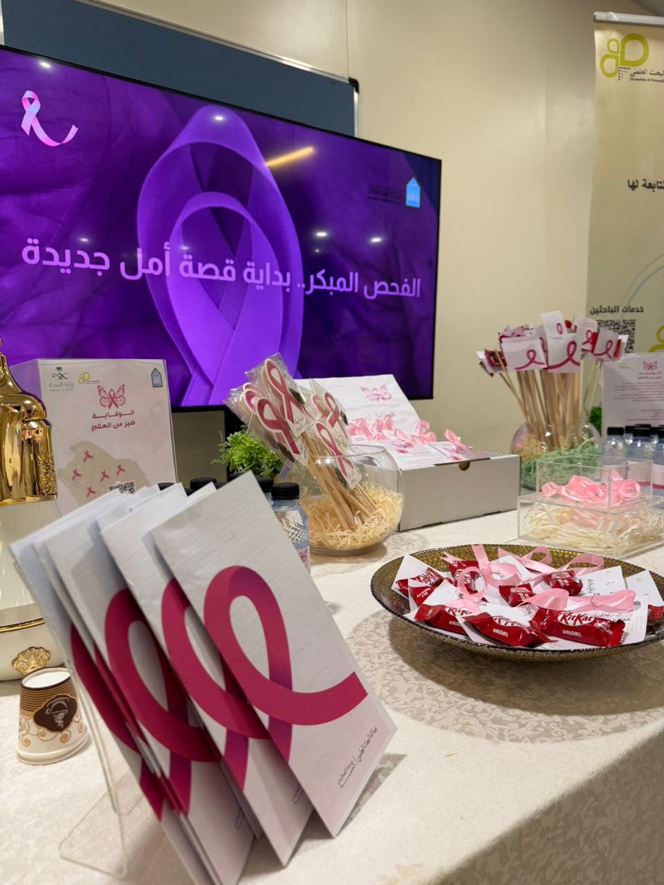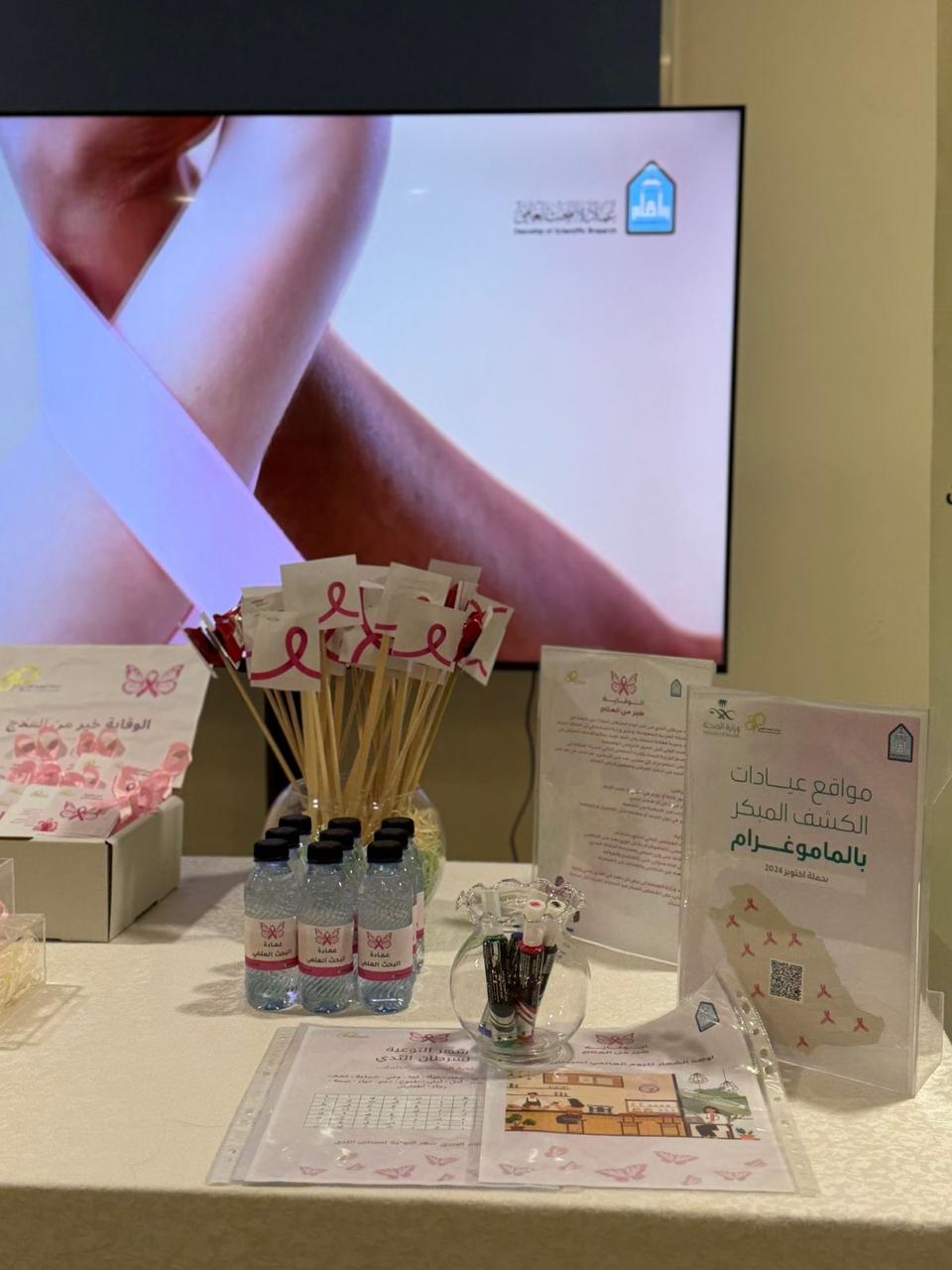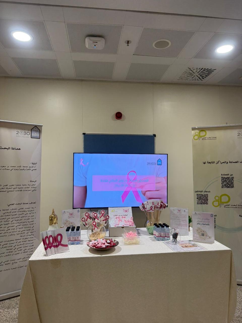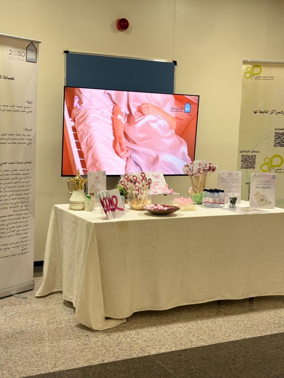 نظّمت عمادة البحث العلمي بجامعة الإمام محمد بن سعود الإسلامية ممثلةً في شؤون التطوير، اليوم الخميس 16 /10/ 2025م، ركنًا توعويًا تحت شعار “أكتوبر الوردي” للتوعية بسرطان الثدي، وذلك في البهو الرئيسي بمبنى (321) بمدينة الملك عبد الله للطالبات.