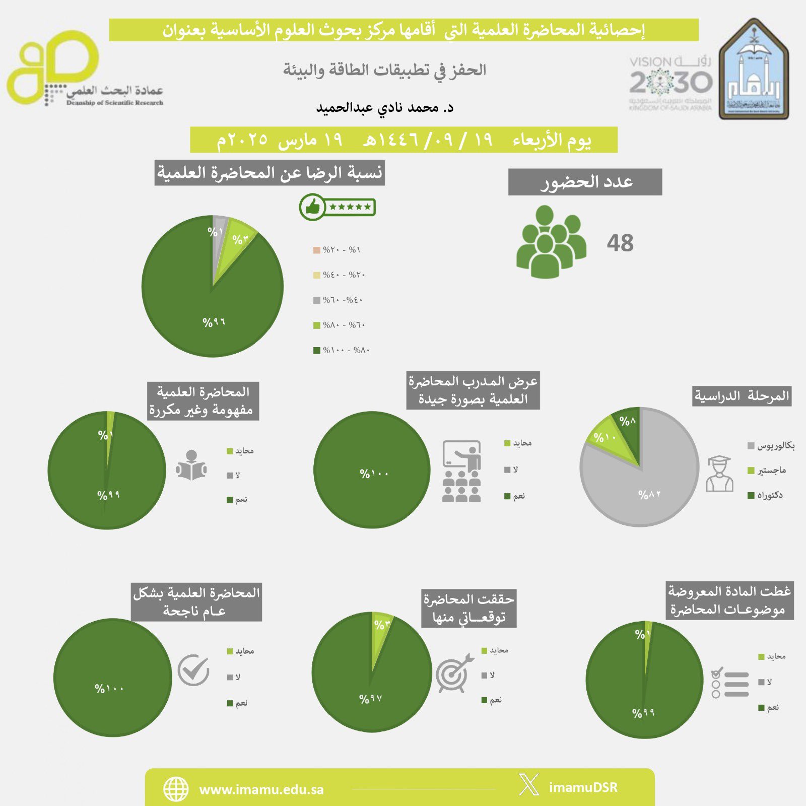 عمادة البحث العلمي تنشر إحصائيات المحاضرة العلمية (فيزياء وتقنيات الخلايا الشمسية: الأساسيات والاتجاهات البحثية)